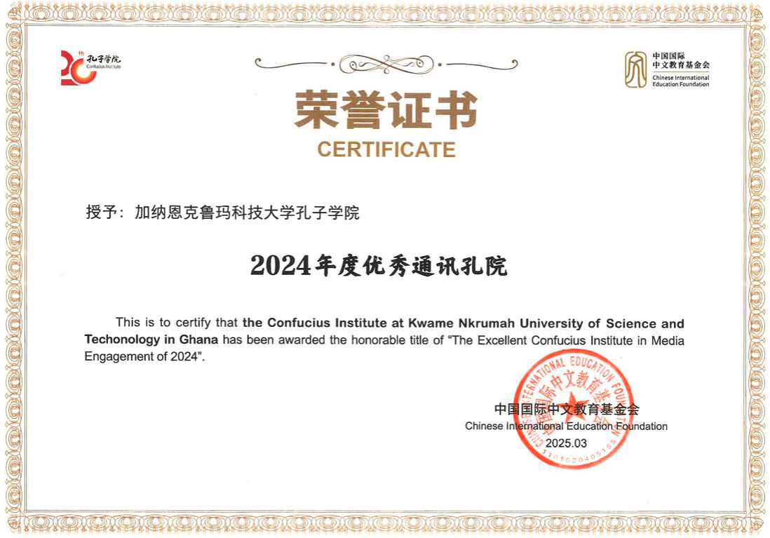 本网讯(文/何静)近日,中国国际中文教育基金会公布了“2024年度优秀通讯孔院”名单,我校与加纳恩克鲁玛科技大学共建的孔子学院成功入选,成为全球61所获奖孔院之一。
