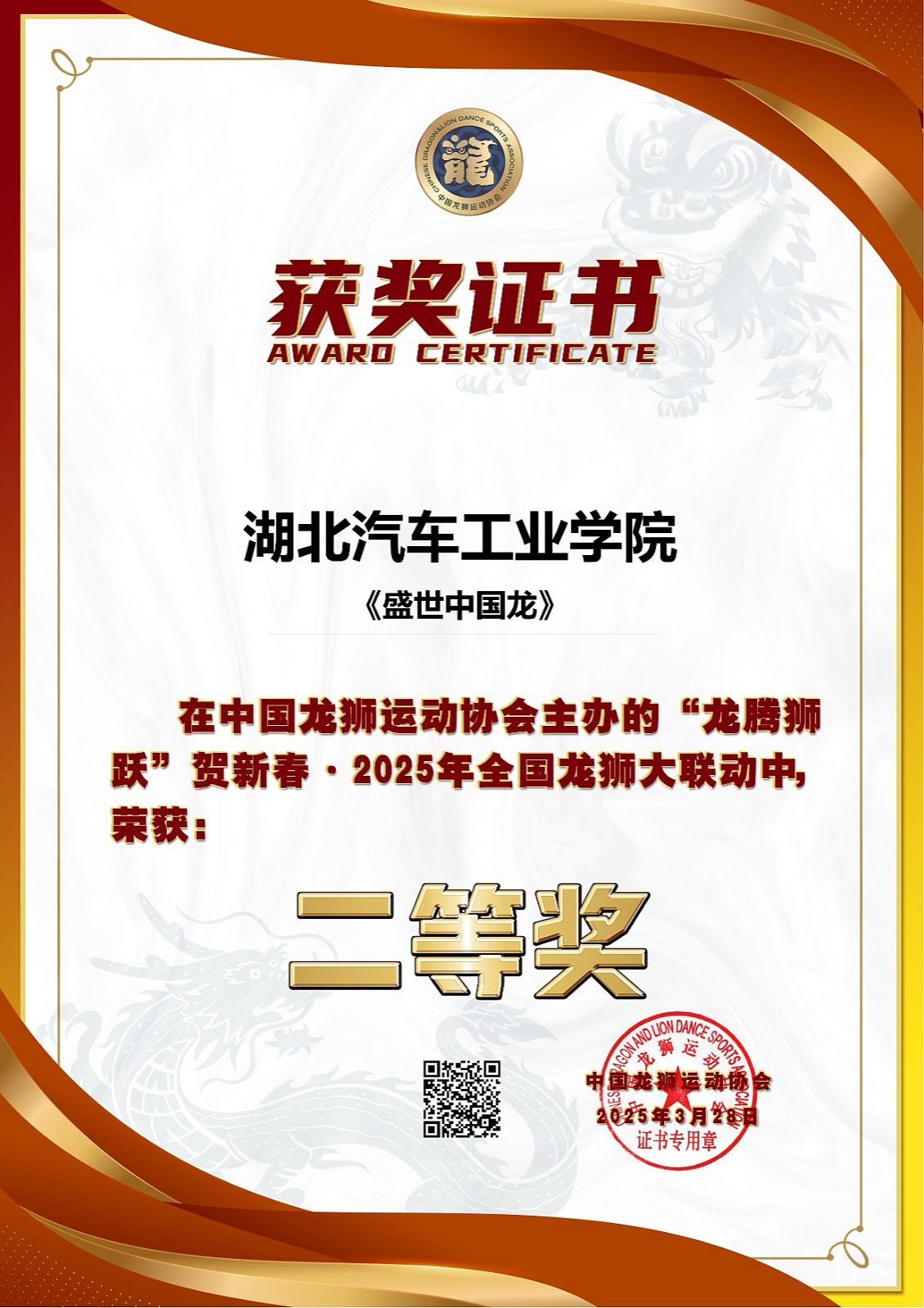 我校龙狮队携手普通体育(龙狮运动)课程班学生,在体育学院教师余腾、周胜带领下,凭借作品《盛世中国龙》斩获二等奖。作品巧妙融合传统龙狮技艺与现代编排,借助“祥云翻腾”“双狮戏珠”等动作,生动展现中华传统文化的独特魅力。参赛队员配合默契,用精湛技艺诠释“盛世中国”主题。