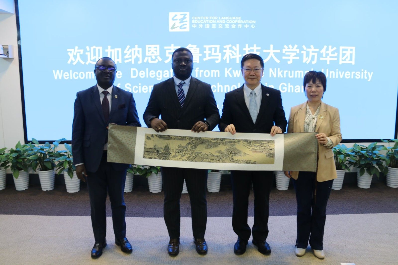 本网讯(文/方鹏)4月30日,加纳恩克鲁玛科技大学代表团、我校副校长张红霞一行访问了教育部中外语言交流合作中心。语合中心副主任胡志平会见了代表团一行。