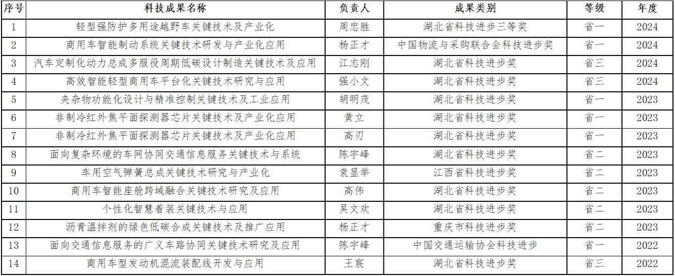 科研成果突出,获得多项国家级、省级奖项。2024年度实验室考评结果为:优秀/标杆。自成立以来,实验室先后承担了国家863计划项目、国家科技支撑计划项目、湖北省重大专项等各类课题50余项,发表高水平科研论文200余篇。其中“混合动力城市客车节能减排关键”项目成果获2009年国家科技进步二等奖;“东风风神E30系列纯电动轿车开发与产业化”项目成果获2016年湖北省科技进步一等奖;“轻型强防护多用途越野车关键技术及产业化”荣获2024年湖北省科技进步一等奖。