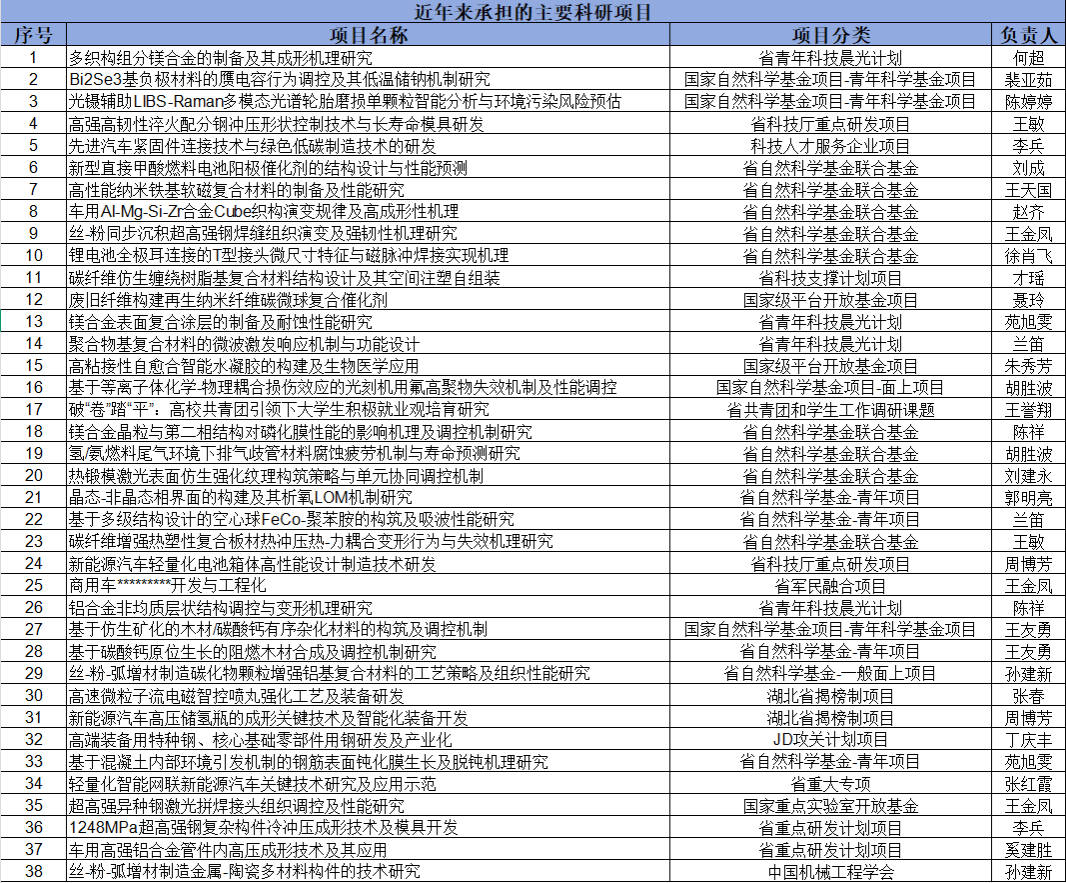 我校主要研究课题一:新能源与智能网联汽车轻量化材料结构一体化成形技术及应用;本项目面向汽车行业高性能和低碳环保的需要,重点研究了超高强钢-高强铝合金汽车构件冲压成形微观组织演化规律和成形精度演变规律,发明了高强钢高强韧热冲压成形技术和高强铝合金预硬化高质高效成形制造技术。技术现已应用于东风汽车轻量化零部件生产,同步提升了湖北省汽车行业轻量化技术。高强钢、高强铝合金、液态电池能量密度、白车身轻量化系数4项技术达到国际领先水平。