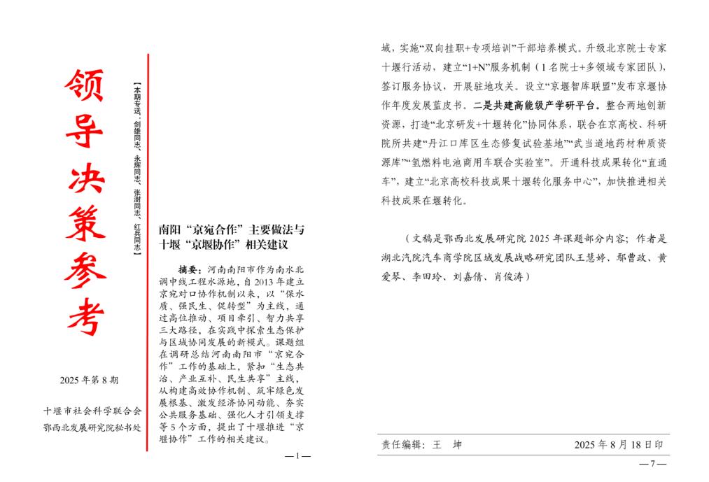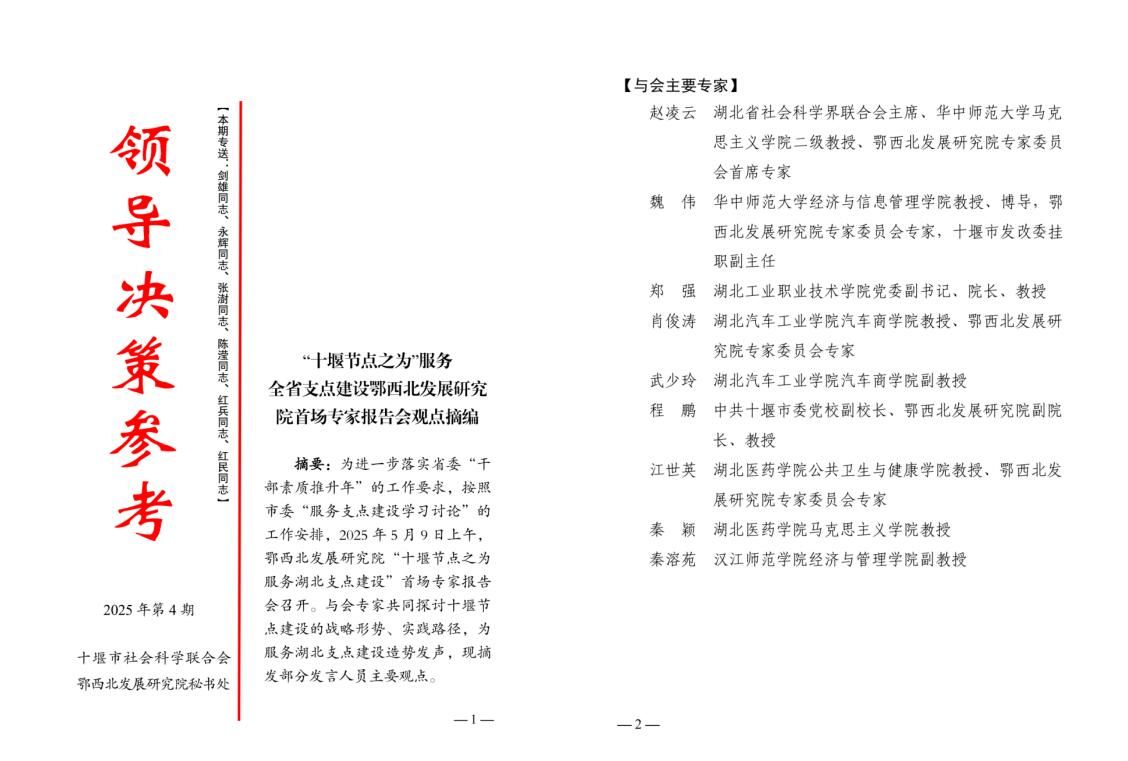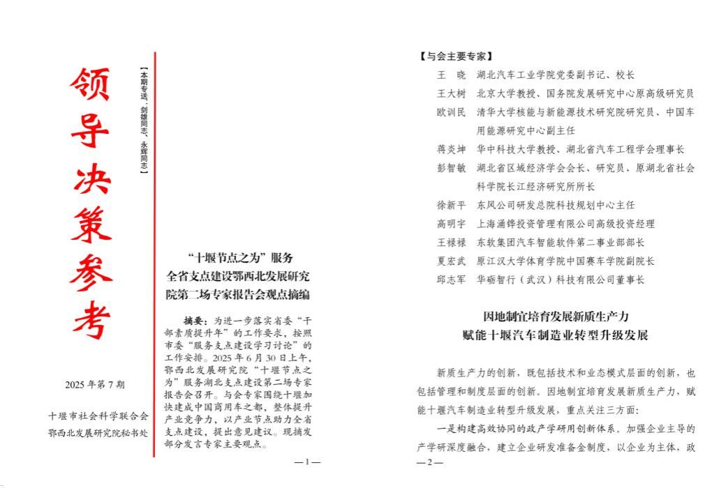 研究院成立以来取得了显著成果。获批2025中国调查项目1项,湖北省第十四届人文社科优秀成果三等奖1项,举办湖北发展智库恳谈会2025年第三场“科技创新和产业创新深度融合赋能湖北汽车产业转型升级”,举办“十堰节点之为服务湖北支点建设”专家报告会三场,3篇资政报告获十堰市主要领导签批。