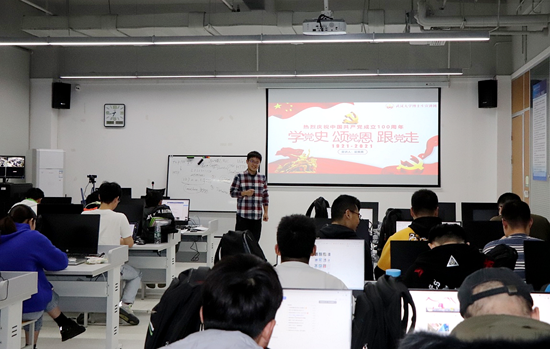 本网讯(文/图 张运)3月28日晚,一场主题为“学党史、颂党恩、跟党走”的党史学习教育专题辅导报告走进我校武汉实践教学基地,为智能181、182班学生带来了一堂生动的党史学习教育课。专题辅导报告由武汉大学博士生宣讲团成员、2020级计算机学院博士研究生梁黄黄主讲,武汉基地全体学生和相关教师聆听了报告。