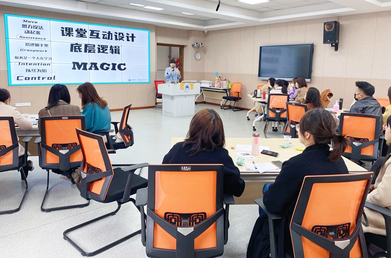 叶慧结合自身教学实践,分享了我校外国留学生参与其英语口语课程教学互动活动的案例,介绍了课堂互动活动设计的方法与技巧。在互动交流环节,国际合作与交流处的教师方鹏分享了“voxpops”互动设计理念,外国语学院教师汪梦楚分享了其参加美国凯特林大学在线英语课程中学到的“three-two-one”三步骤讨论法。叶慧总结了课堂互动设计的底层逻辑,自创用首字母“MAGIC”表达让学生在课堂中动起来,借助教师搭建的脚手架,通过团队协作以教学目标为导向地开展课堂互动活动。