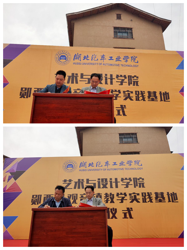 本网讯(文/罗诗棋)4月9日下午,艺术与设计学院与郧西县观音镇在双石沟举行战略合作协议签约暨教学实践基地揭牌仪式。湖北汽车工业学院党委副书记杨立志、中共郧西县委副书记许庆一、县人大常委会副主任许庆东、艺术与设计学院书记兼院长陈旭红、观音镇党委书记胡世华、郧西县恒达扫帚专业合作社理事长胡朝柱出席活动现场。艺术与设计学院王中等9名老师和学院2019级115名在观音镇开展写生的学生一同参加本次活动。