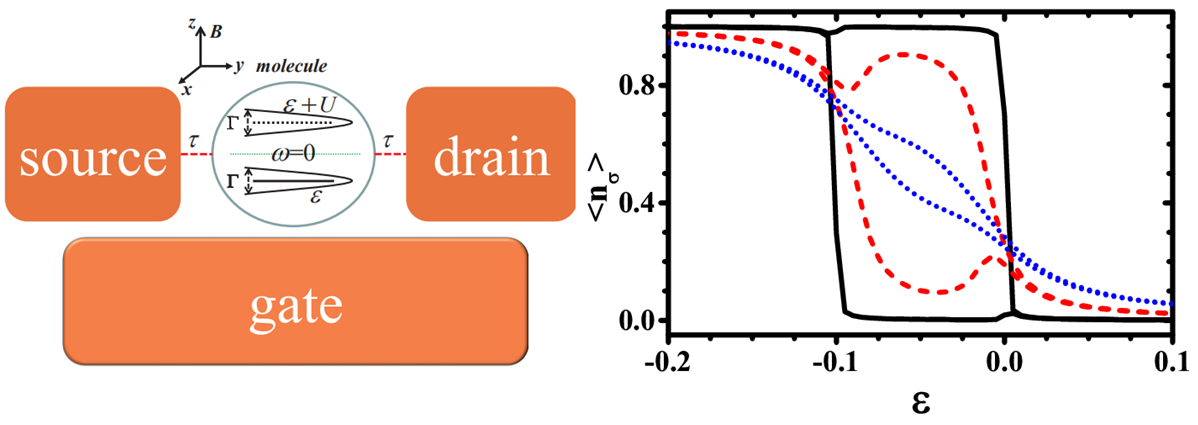 一般而言,单分子晶体管中的电荷占据遵循库伦阻塞效应,其电荷占据图像应表现出单调占据特性。但在本文中,团队基于一个外磁场中的单分子晶体管,预测了两个自旋方向的电荷占据可能表现出非单调的填充行为,其主要特征表现为自旋敏感的电荷振荡,违反了标准的库仑阻塞行为。系统研究表明,这类非单调性可归结于塞曼效应、多体效应、以及量子态对称性之间的竞争。要获得显著的电荷振荡,强电子-电子相互作用和足够的低温是先决条件。在此基础上,团队还指出振荡行为与自旋极化输运的存在条件是截然相反的。在适当的参数下,该模型可以表现为一个电压可控的双向分子自旋电子学器件。