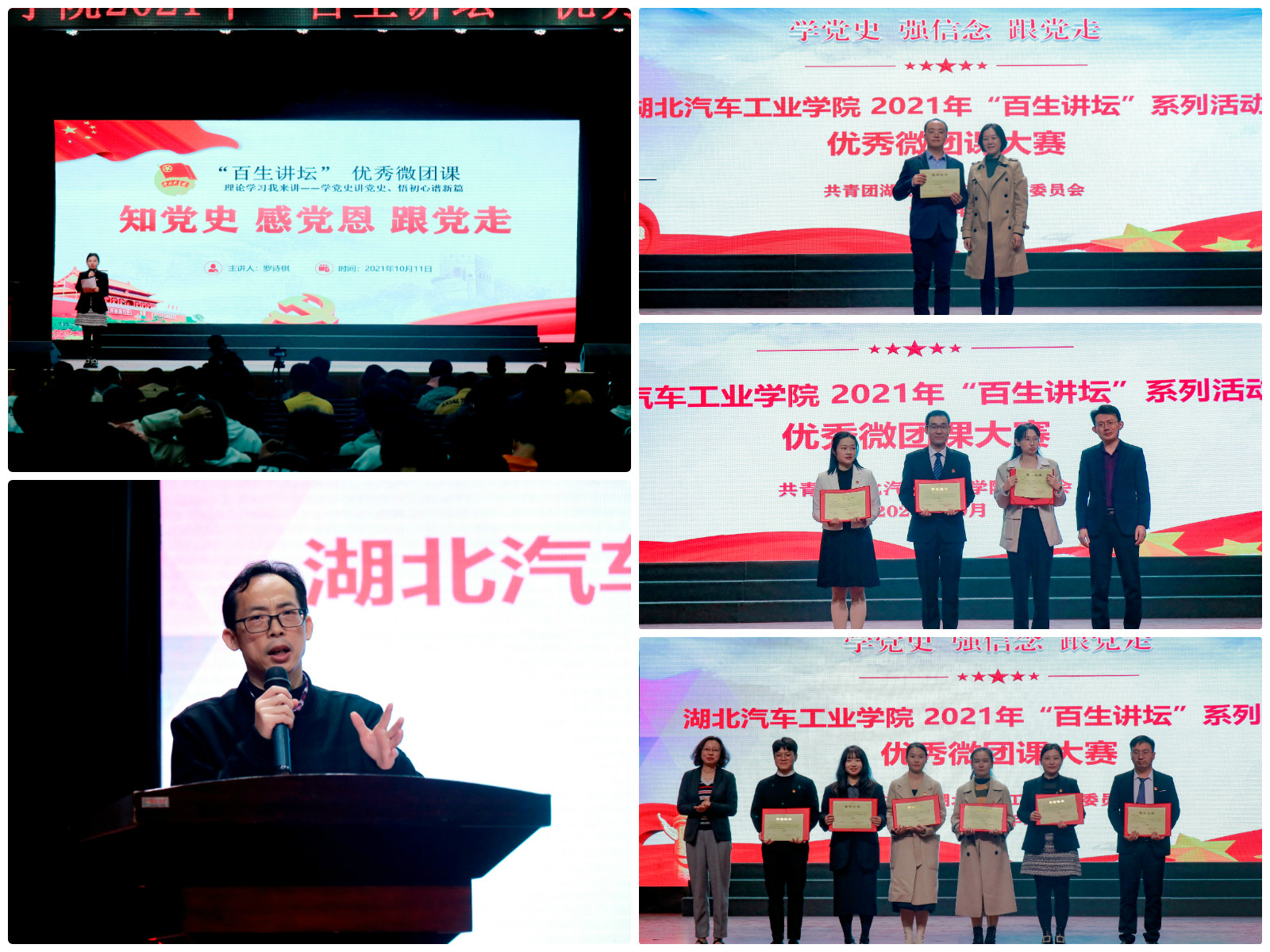 经过现场评比,经济管理学院代将来老师微团课《见字如面—重读红色家书传承红色基因》荣获一等奖;校团委肖一轩老师微团课《缅怀革命先烈青春致敬祖国》、数理学院卢旭老师微团课《一江清水送北方当好时代守井人》、汽车工程学院李键雯老师微团课《百年征程波澜壮阔重温党史砥砺前行》荣获二等奖;材料学院李诗老师微团课《学好党史、国史牢记初心使命》等荣获三等奖。前5名获奖老师将推荐参加省赛。与会领导嘉宾分别为获奖老师颁奖。