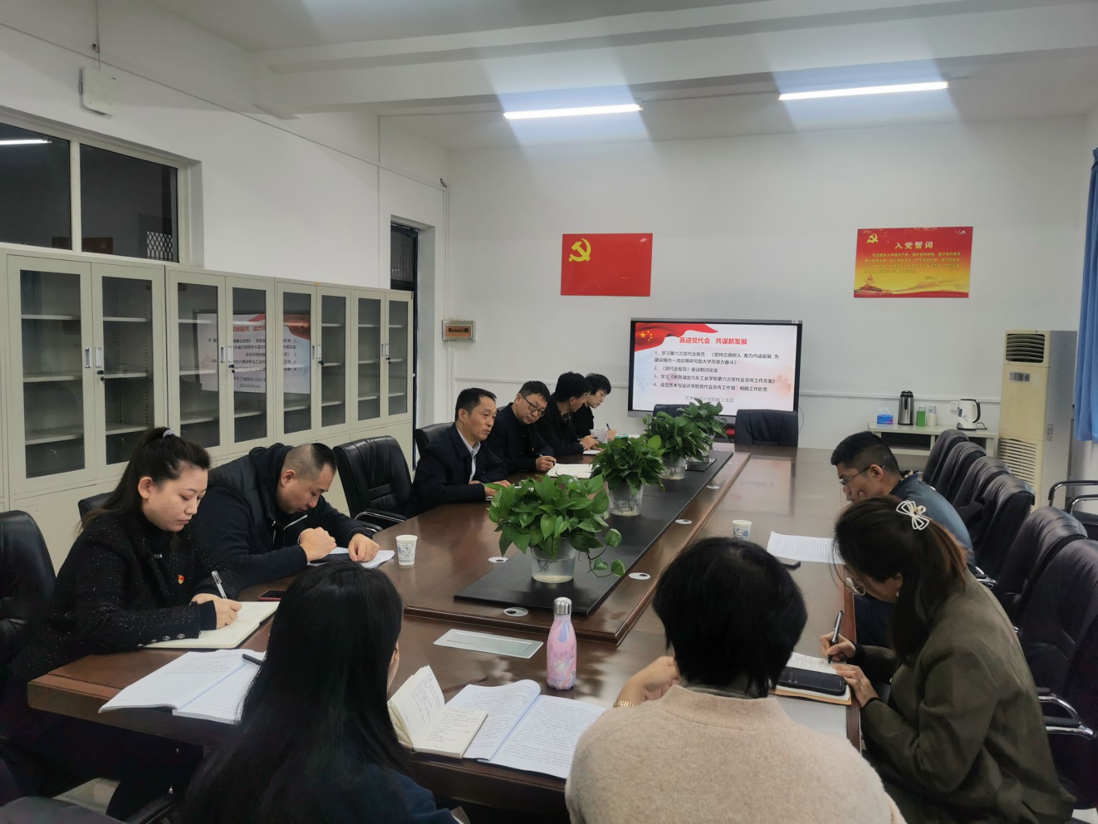 接下来,全体教工党员学习了中共湖北汽车工业学院第六次党代会宣传工作方案,从成立专班小组、宣传党代会内容及意义、对优秀党员及个人宣传推介、细化阶段工作四个方面进行工作部署。与此同时,陈旭红同志对此次宣传工作进行了具体安排。