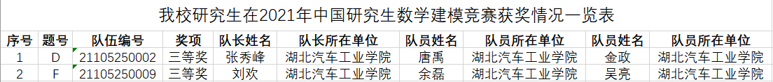 本网讯(文/何君)近日,2021年“华为杯”第十八届中国研究生数学建模竞赛落下帷幕,我校研究生参赛队伍在本次竞赛中斩获佳绩,荣获全国三等奖2项。