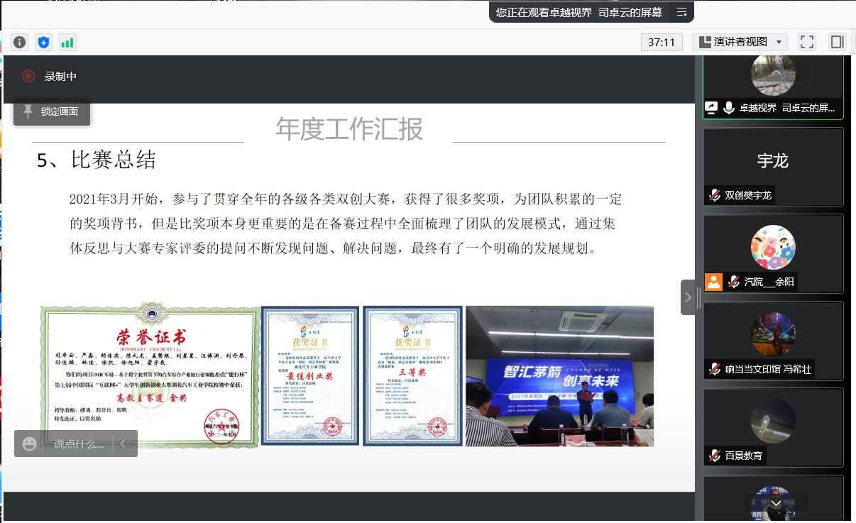 最后,双创学院基地管理办公室主任程鹏总结发言,对2021年创业基地企业的努力和取得的成绩给予了充分的肯定,就2022年大学生创业工作提出了三点要求。一是各企业负责人要对工作计划进行细致规划,将规划落实落细,确保各项工作计划能有序开展,并及时汇报工作进度,创业基地办公室将会把工作开展情况纳入绩效考核中。二是各企业加强与基地管理办公室沟通联系,积极为基地管理建设工作建言献策。同时,提出2022年基地管理办公室也将围绕基地企业发展做好相关服务管理工作。三是2022年双创学院将围绕“基地建设年”组织开展系列企业交流提升活动。希望各企业积极参与到活动中,要解放思想,发掘创业潜力,共同努力成为湖北省高校大学生创业典范与榜样。