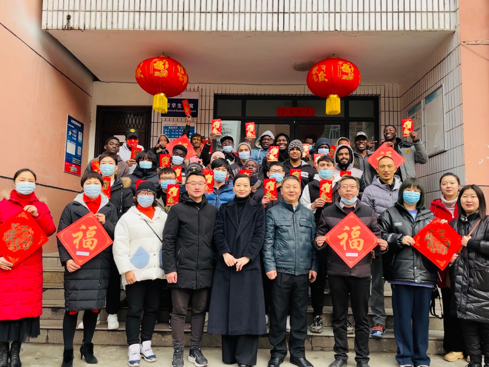 19名外国留学生和6名中国学生手握红包,高举“福”字,齐声喊着“新年快乐”,感恩来自社会各界和学校的温暖与关怀。洋溢在脸上的喜悦,是他们留校快乐过春节的最真实写照。