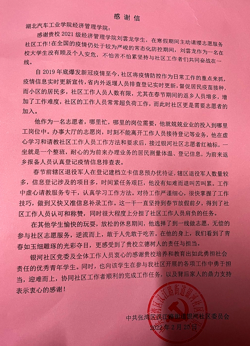十堰市张湾区汉江路街办的来信中说到:“大数据211班刘雲龙同学没有顾及个人安危,不怕苦不怕累坚持与社区工作者们共同奋战在抗疫一线。他作为一名志愿者,哪里忙,哪里的工作岗位需要,他就兢兢业业地投入到哪里的工作岗位中,得到了社区工作人员的认可和称赞。”