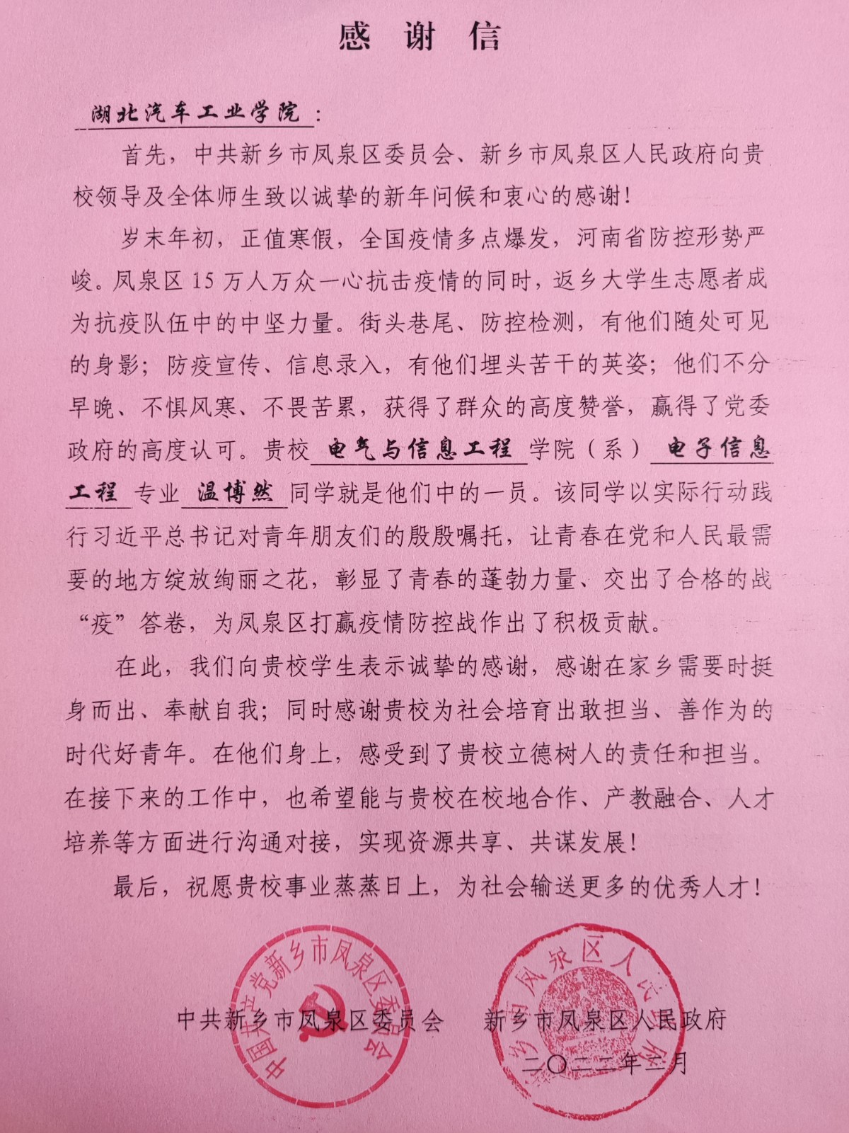 本网讯(文/候猛)日前,电气与信息工程学院收到一封来自中共新乡市凤泉区委员会、新乡市凤泉区人民政府的感谢信。信中对电气与信息工程学院电信213班温博然同学在疫情防控志愿服务工作中的贡献表示衷心的感谢和高度认可,感谢我校为社会培育出了敢担当、善作为的时代好青年。通过学生疫情期间的工作表现,当地政府感受到了我校立德树人的责任和担当。