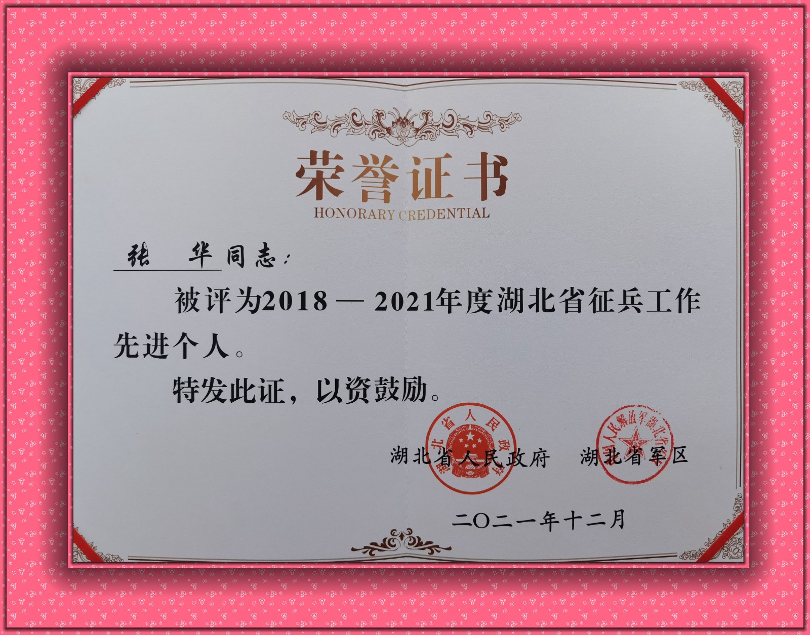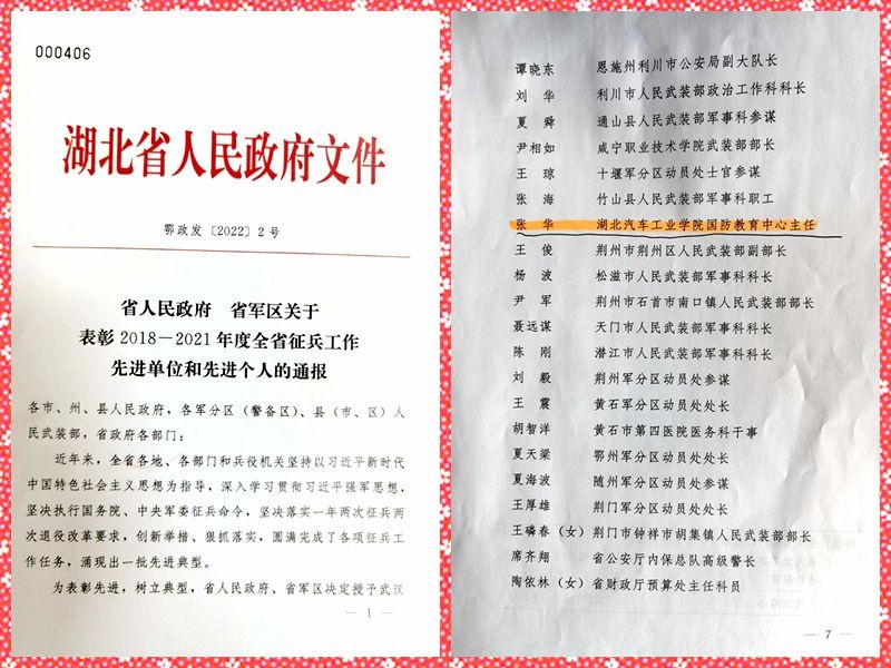 本网讯(文 赵伟/图 张华)为表彰先进、树立典型,激励广大征兵工作人员在今后工作中奋发进取、建功立业,经省人民政府、省军区决定,授予50个单位“湖北省征兵工作先进单位”称号、49名同志“湖北省征兵工作先进个人”称号,我校保卫处(人武部)张华老师受到通报表彰。
