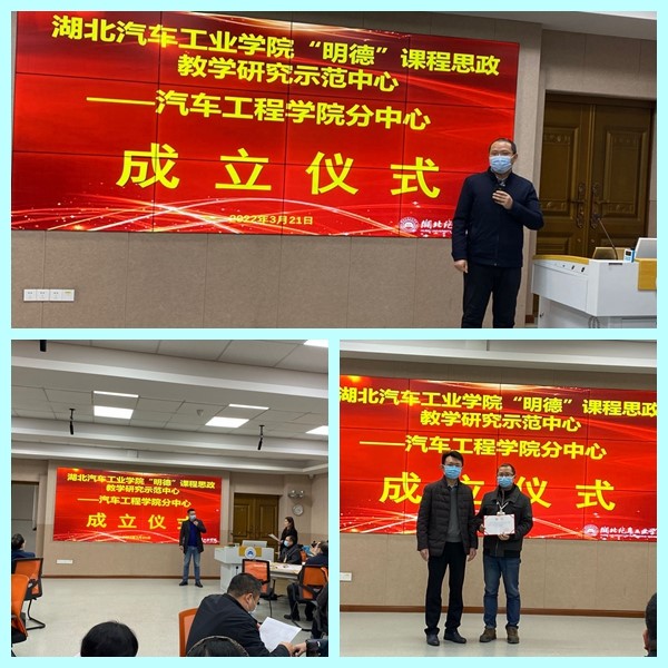 按照学校《关于成立“明德”课程思政教学研究示范中心分中心的通知》,作为学校二级学院第一个分中心,此次活动首先进行了“明德”课程思政教学研究示范中心汽车工程学院分中心成立仪式。李建在致辞中首先对汽车工程学院分中心的成立表示祝贺,并肯定了学院在推进全校课程思政教学改革方面的带头作用,明确了从学校到学院层面今后推进课程思政工作的方向和重点。黄永昌在致辞中希望汽车工程学院和马克思主义学院共同协作,做好“明德”课程思政教学研究与改革工作。随后周红妮宣读了汽车工程学院分中心的组织架构和职责,并由学院分党委书记李秀峰向分中心第一位特聘研究员郭一鸣教授颁发了聘书。