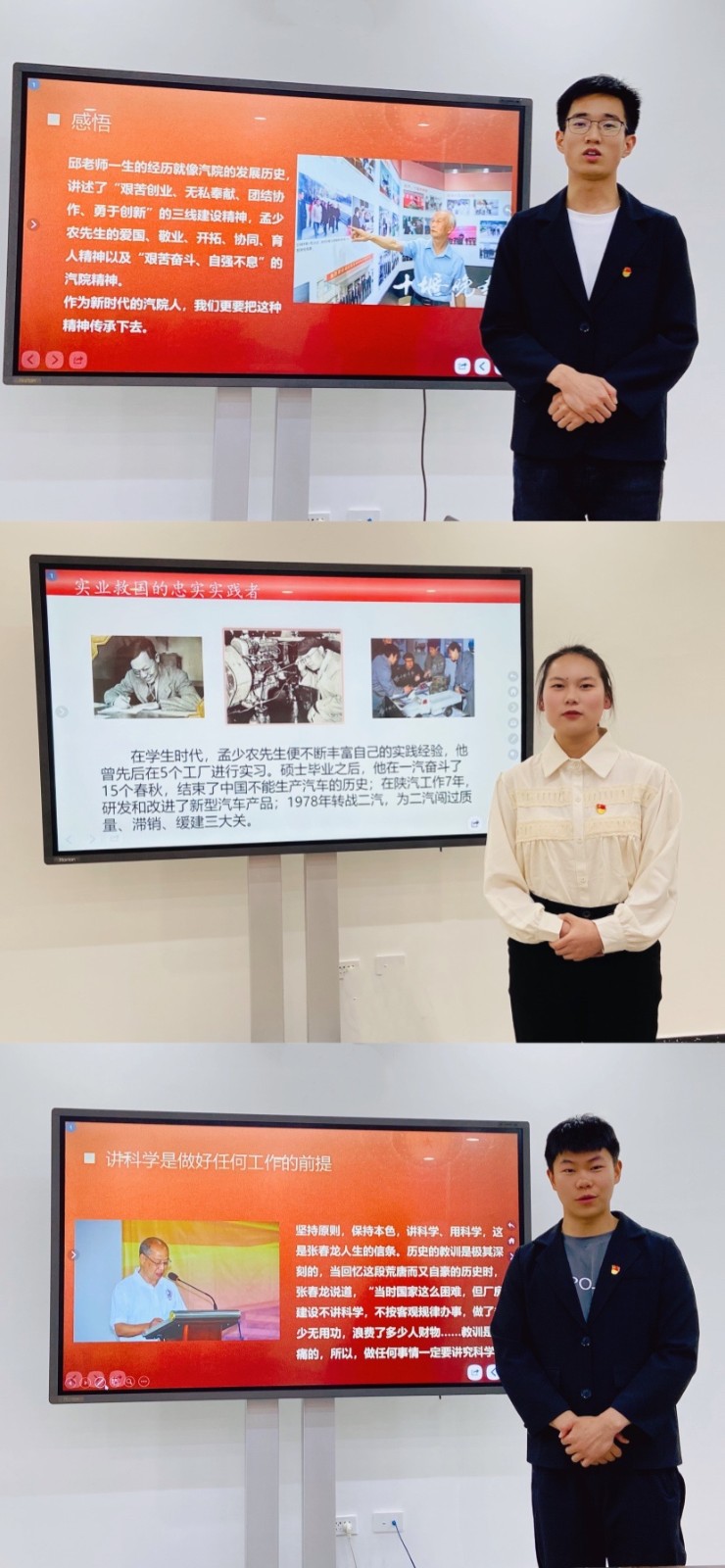 本次微党课的主讲人为学生党员陈浩、武子豪、潘喜悦,主题分别为《八旬退休教师义务讲党史二十载》《情系东风终不悔》《以奋斗为曲,普人生之歌》。陈浩讲述了我校汽院退休教师邱春正老师的故事,他向我们分享了他自己眼中的邱春正老师的事迹,用自己切身的体会表达了对邱春正老师的敬意。武子豪讲述了湖北汽车工学学院退休教授、张湾公园社区老年大学教师张春龙老师,分别从“我是党员,就要听党的话”“一根扁担,两盏马灯”是二汽创业精神、“发挥余热,奉献社会”三方面讲述了张春龙老师的伟大事迹,不仅让全体党员学习到了张春龙老师身上的精神,也让学生党员对自己的发展目标有了更清晰的规划。潘喜悦为大家讲述了孟少农院士的故事,她介绍了孟少农院士的多重角色,正是在这多重角色之中让全体党员了解了孟少农院士的努力和奋斗精神,特别是对湖北汽车工业学院的奉献精神让全体党员为之感动。