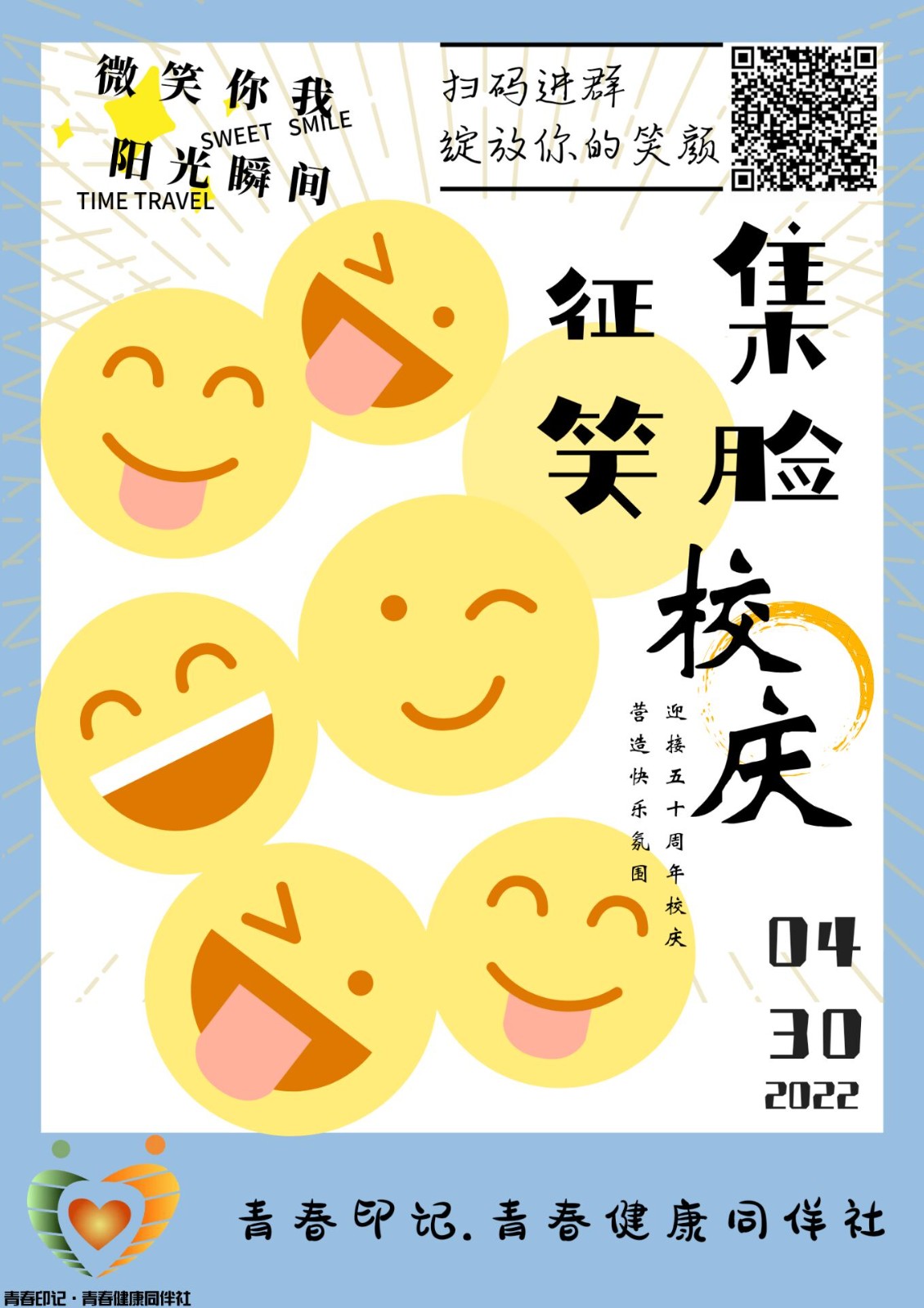 本网讯(文/谢玲莉)4月20日-5月30日,学校青春印记·青春健康同伴社组织开展“微笑你我阳光瞬间”为主题的“百张笑脸献祝福”迎校庆笑脸征集活动。