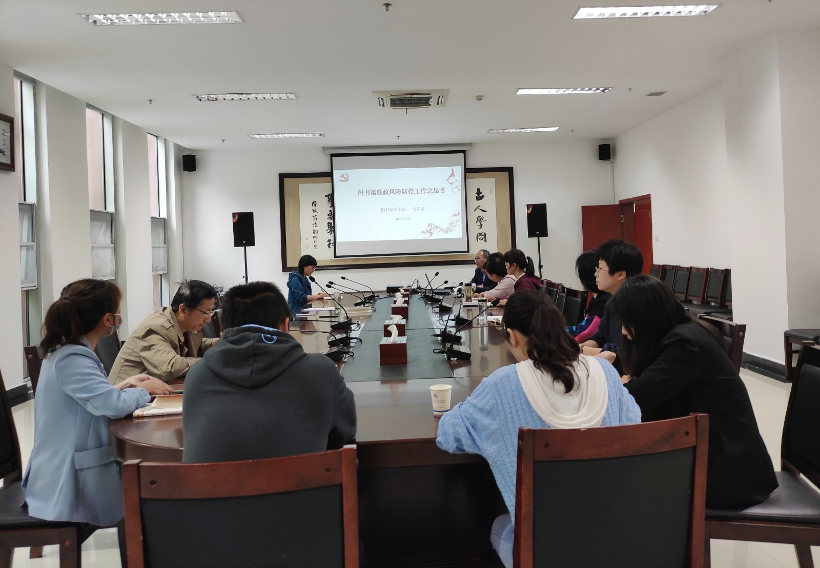 马均秦对图书馆在思想信念、岗位职责、业务工作中可能存在的廉政风险点进行了梳理评估。一是查找分析岗位职责风险。依据岗位职责,结合以往履行职责、执行制度的实际情况,认真排查可能发生的“一岗双责”履职不到位的各类风险。二是查找分析单位、部门业务工作风险。结合图书馆收支管理、资产管理内容和职责,列举近年来的典型违纪违法案例,分析了图书管理业务工作的风险点及防控措施,警示大家“风险就在身边”、“有权力就有廉政风险,有风险就要警示防范”。三是分析研判了图书馆在政治生态、意识形态、平安建设中责任险及防控措施。最后,解读了违反八项规定清单80条的具体内容和学校重点监督事项清单。