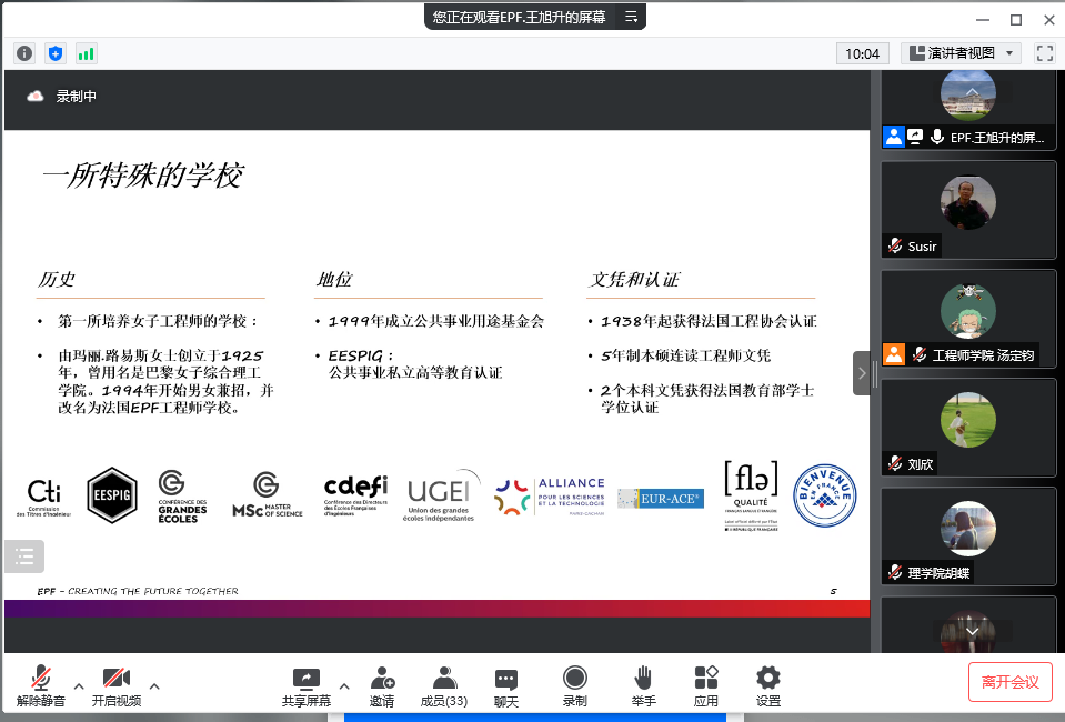 线上交流会上,Pierre JIANG老师介绍了赴法留学的和硕士项目并分享了自己留法学习工作经历。来自特鲁瓦校区大一年级主任Xixi WANG博士介绍了交换生项目。随后,双方就共同感兴趣的话题进行了交流。
