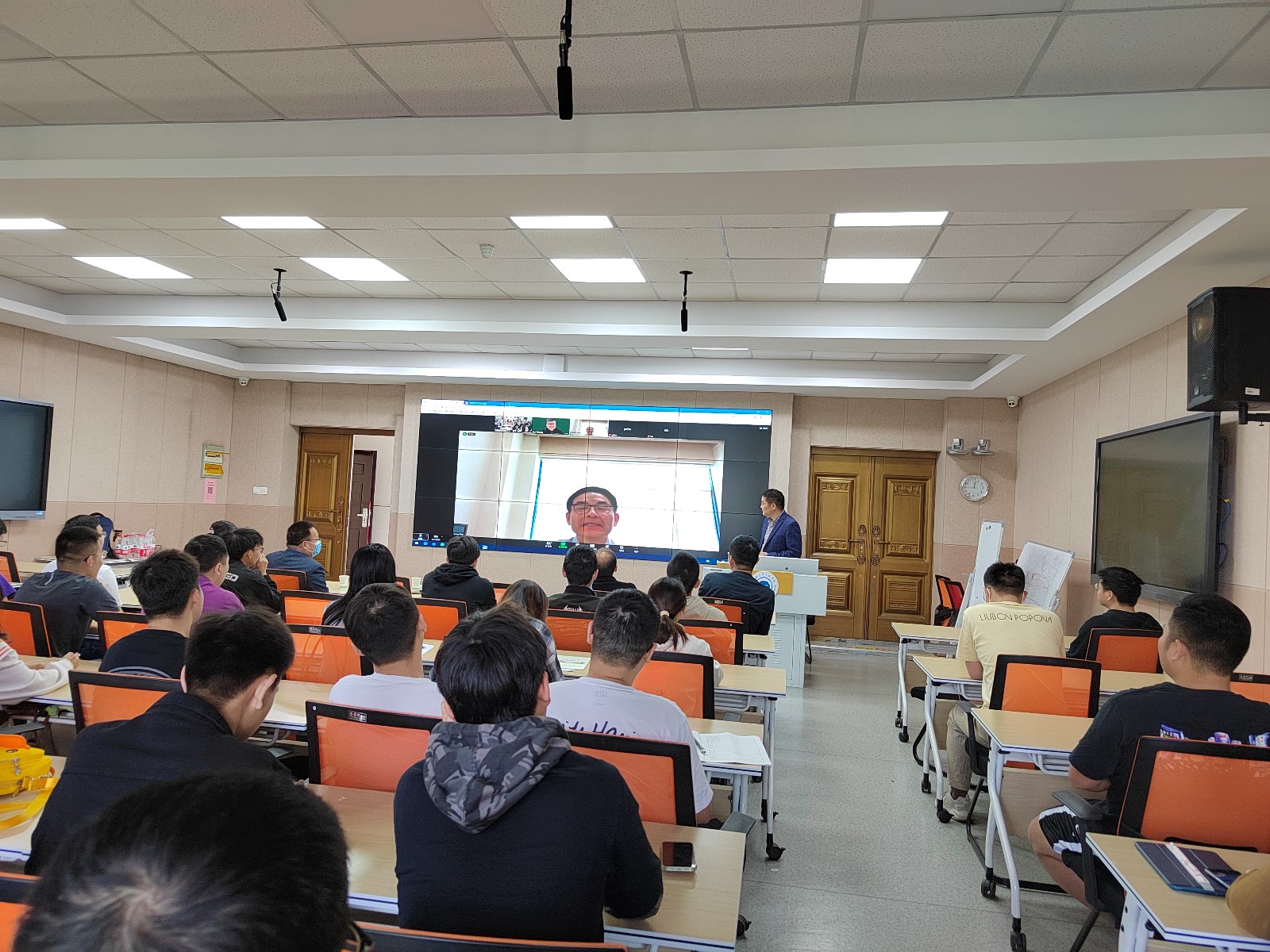 本次讲座电信学院书记周鹏、副院长黄海波、国合处副处长苏子波及部分教师和研究生聆听了此次报告,黄海波教授主持报告会。本次报告会采用线上线下同步进行,辛教授远程进行报告,我校优秀校友黄俊博士也在网上同步进行报告解读。