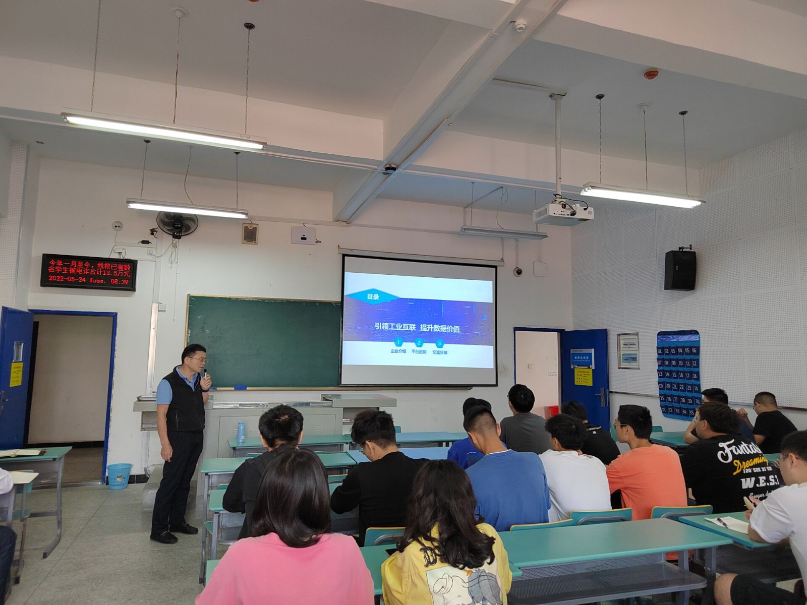 本网讯(文/丁光惠)5月24日上午,健新科技有限公司董事长张振华在学校6309教室为电院师生进行了《工业互联网平台介绍及应用》的讲座报告以及个人创业经历的分享交流会,电信学院分党委书记周鹏主持会议。