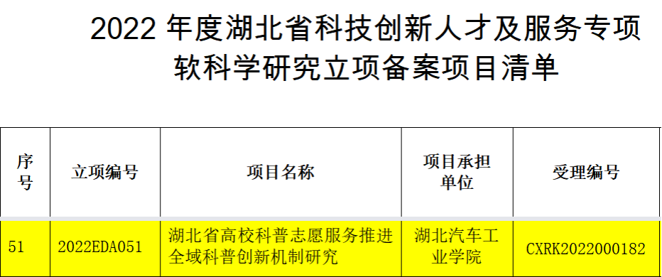 本网讯 近日,2022年度湖北省科技创新人才及服务专项软科学研究项目立项清单公示,经济管理学院物流管理专业鄢曹政博士申报的课题《湖北省高校科普志愿服务推进全域科普创新机制研究》成功获批。