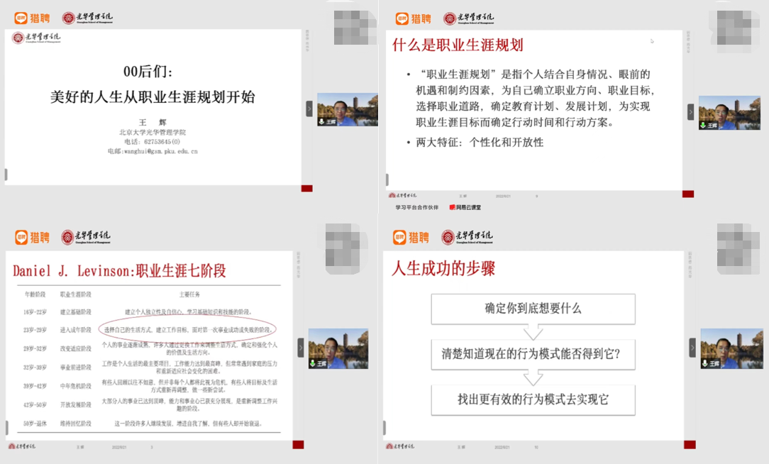 此次讲座主讲嘉宾为北京大学光华管理学院党委副书记王辉教授,讲座中,王辉从“人生发展阶段”、“大五人格模型”、“什么是职业生涯规划”、“管理人员的职业生涯发展周期”、“人生成功的步骤”、“目标的作用”、“敬业与专业及其实施途径”、“心理资本与竞争优势”、“如何提升心理资本”等内容入手,结合管培生岗位,详细回答了“什么是管培生”、“如何判断个人是否适合管培生”、“如何做好职业生涯规划”等问题。
