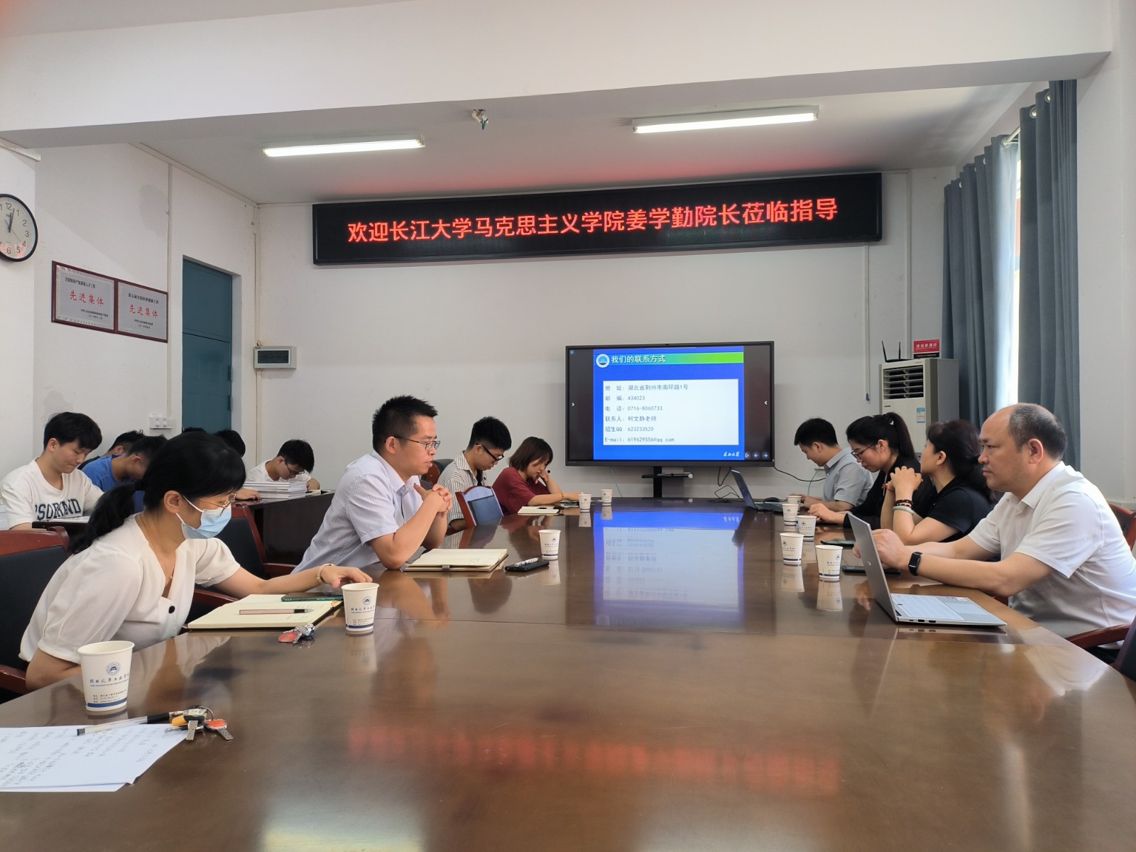 本网讯(文 滕文艳/图 刘明辉)6月22日上午,长江大学马克思主义学院院长姜学勤、院办主任徐先荣、教学科研办主任柯文静、“生命长江”教研室副主任何波一行来我校马克思主义学院考察交流。马克思主义学院副院长(主持工作)黄永昌、副院长成继平、思政课部主任马保青以及各教研室负责人热情接待了姜学勤一行。