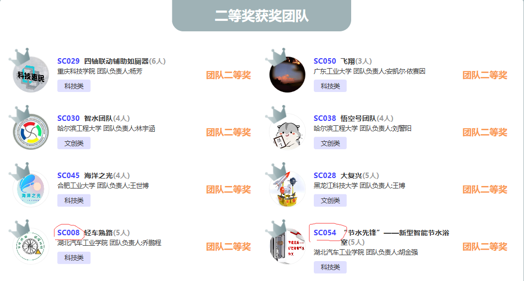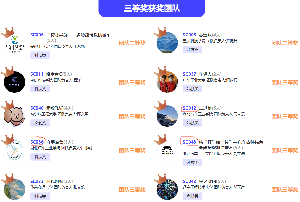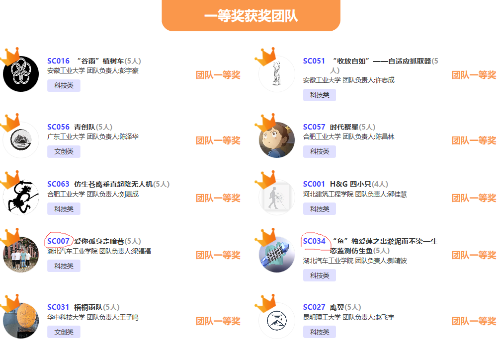 顿亚鹏、刘峰老师指导的参赛作品《全自动落叶清扫收集车》(参赛学生:梁福福、张洪涛、谢铭燕、谢知航、曹子钢)和刘建永、李诗老师指导的参赛作品《生态监测仿生鱼》(参赛学生:彭靖波、王从风、何成朋、王云、周璇)获得全国一等奖;顿亚鹏、刘峰老师指导的参赛作品《新型智能节水浴室》(参赛学生:胡金强、董家新、蔡唐、刘乃畅、周方珂)和李海丰老师指导的参赛作品《玻纤增强聚丙烯停车楔》(参赛学生:乔鹏程、丁梓怡、高继玺、胡一恒、王林玉)获得全国二等奖;顿亚鹏、程稳老师指导的参赛作品《太阳能水陆两栖垃圾收集分类船》(参赛学生:吕志锐、吴旭东、黄文良、周亚东、张思敏)、王敏老师指导的参赛作品《汽车齿件绿色低碳精密制造技术》(参赛学生:刘宇浩、胡金强、董家新、孟城城、王万古)和程登良老师指导的参赛作品《“多能量源”绿色环保助力自行车》(参赛学生:司卓云、杨超、施永泽、李锐、冯采轩)获得全国三等奖。