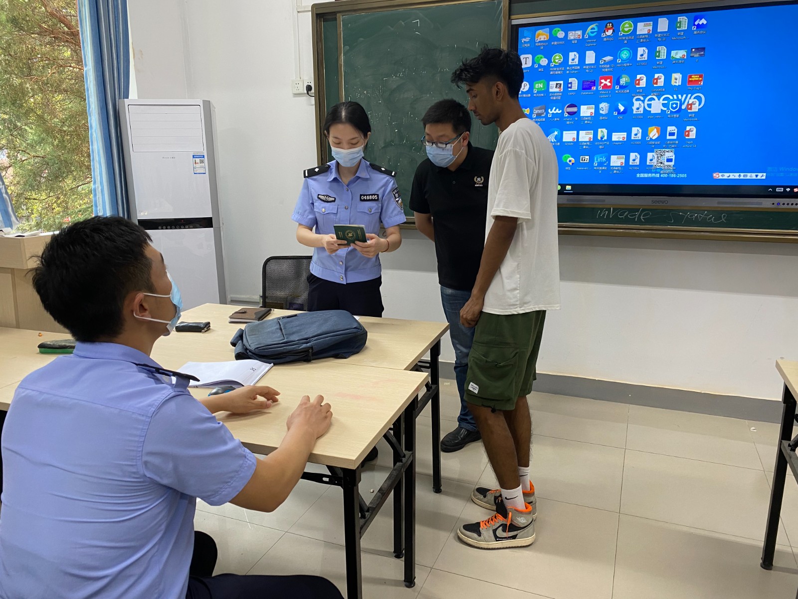 随后,警官们详细询问了我校2019级、2020级、2021级来华留学生及2022级新生的学习、生活和思想动态等相关情况,现场逐一查验了他们的护照、签证、居留许可和住宿登记情况,并同他们进行了友好谈话。本次“平安课堂”活动充分体现了中区派出所端口前移、服务上门的优良工作作风,深受师生称赞。