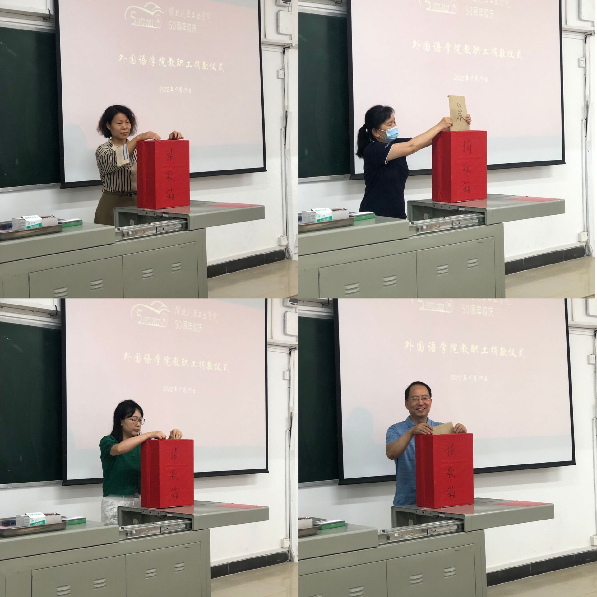 本网讯(文/图 毕云、熊晶)9月19日,湖北汽车工业学院外国语学院庆祝建校50周年捐赠仪式在5203举行。院长朱战炜、书记宋涛、副院长杨荣广、王辰辉出席了捐赠仪式。本次捐赠仪式是一次助力学校又好又快发展的集中捐赠,也是为学校五十华诞献礼,外国语学院全体教职工共同参加了仪式。捐赠仪式由工会主席段艳菊主持,领导和教职工纷纷上台将捐款投入捐款箱,积极为校庆捐献自己的力量。