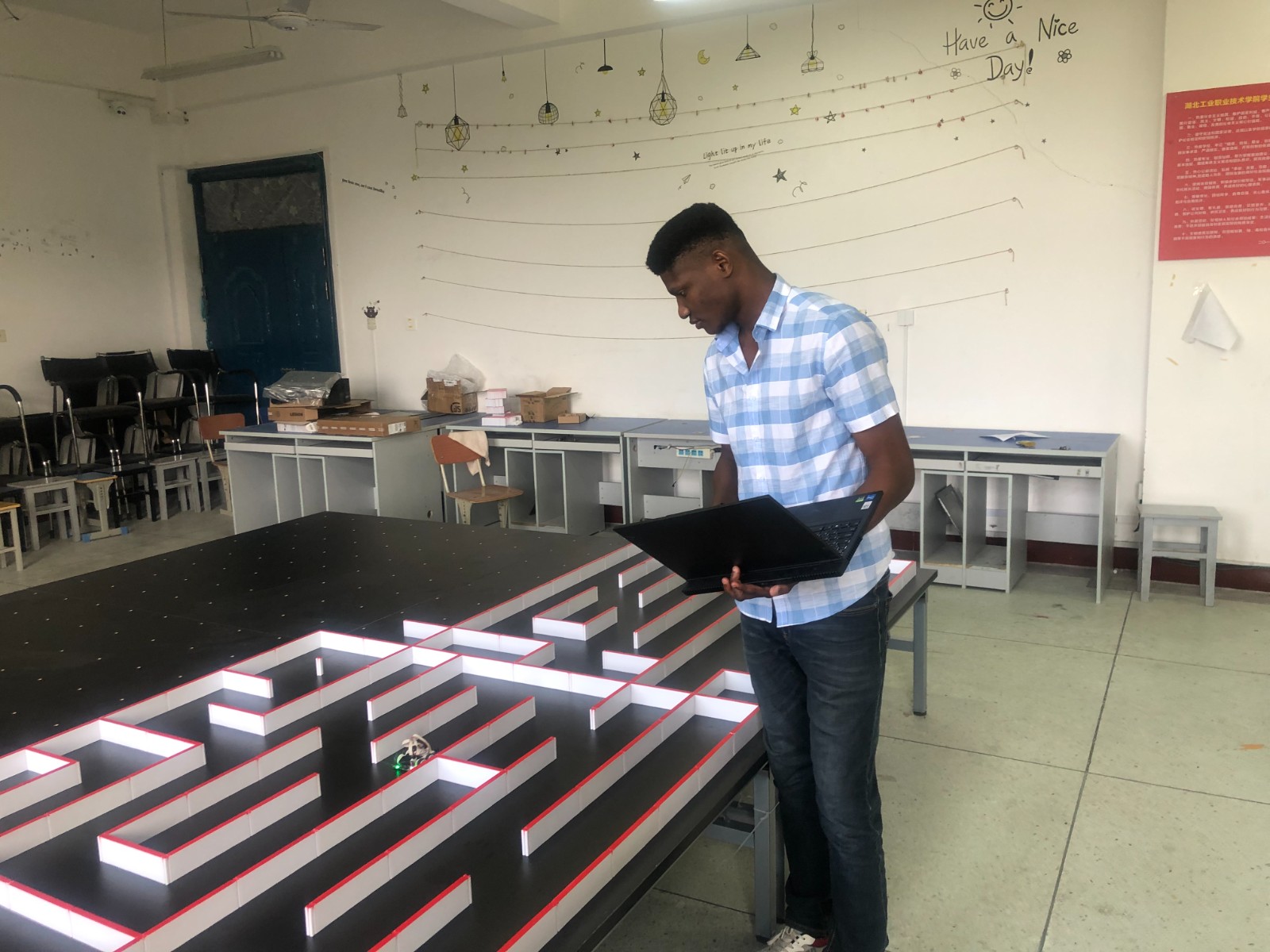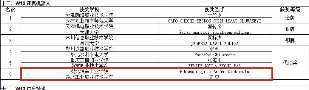 本网讯(文/方鹏)日前,首届世界职业院校技能大赛获奖捷报传来,由我校电气与信息工程学院计算机203班的NDOMBASI DIAKUSALA JOAO ANDRE(中文名安杰)同学与原湖北工业职业技术学院刘爽同学(现已被我校录取为电信Z204班专升本学生)共同组成的联队在大赛迷宫机器人比赛项目中取得第六名的好成绩,获得优胜奖。