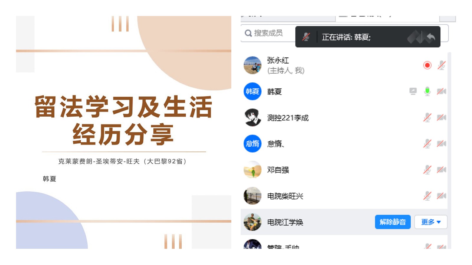 韩夏于2017年通过中法“3+3”项目前往法国克莱蒙奥弗涅大学攻读硕士预科,并于2022年2月顺利进入法国顶尖学府索邦大学攻读博士学位。会议期间,她从留学法国的申请准备、在法的学习生活、疫情下法国实习与博士申请等多方面,分享个人的经验与心得。参会师生受益良多。