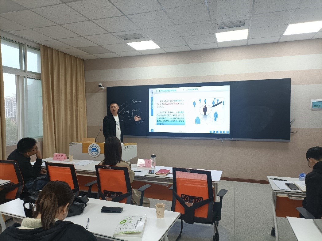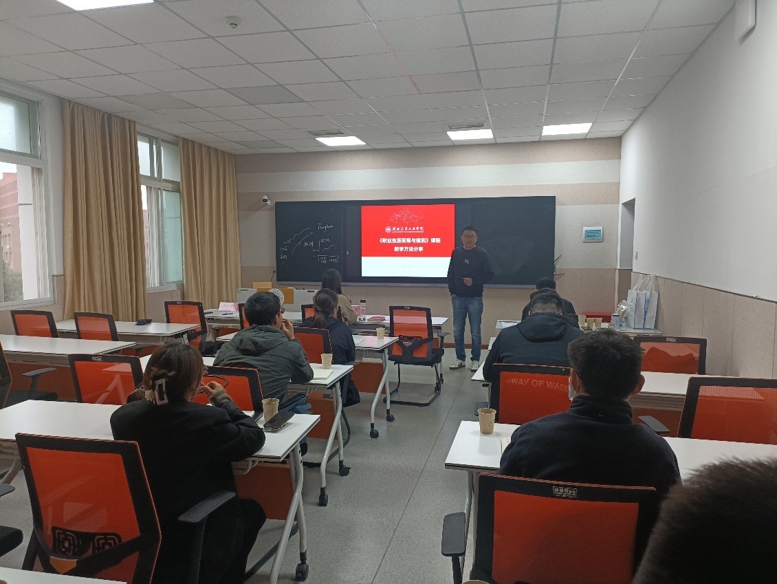 活动中,刘汉朝应邀做了“《职业生涯发展与规划》课程教学方法”专题分享。他从视觉教具的使用与表达技巧、非语言表达技巧、语言表达技巧等方面讲解了教学过程中激发学生学习动力和增强课堂互动性的常用方法以及注意事项,并以《大学生职业生涯发展与规划》课程为例,详细讲解了参与式教学方法在课堂教学中的应用。刘汉朝还结合个人职业经历现场和与会教师进行了交流互动,认为新入职教师在课堂教学中存在自信心不足、学生学习积极性难以调动等问题是正常现象,可以在认真备课、练习教学技能、善用教学案例等方面下足功夫,最终能够提高个人课堂教学自信心和教学能力。