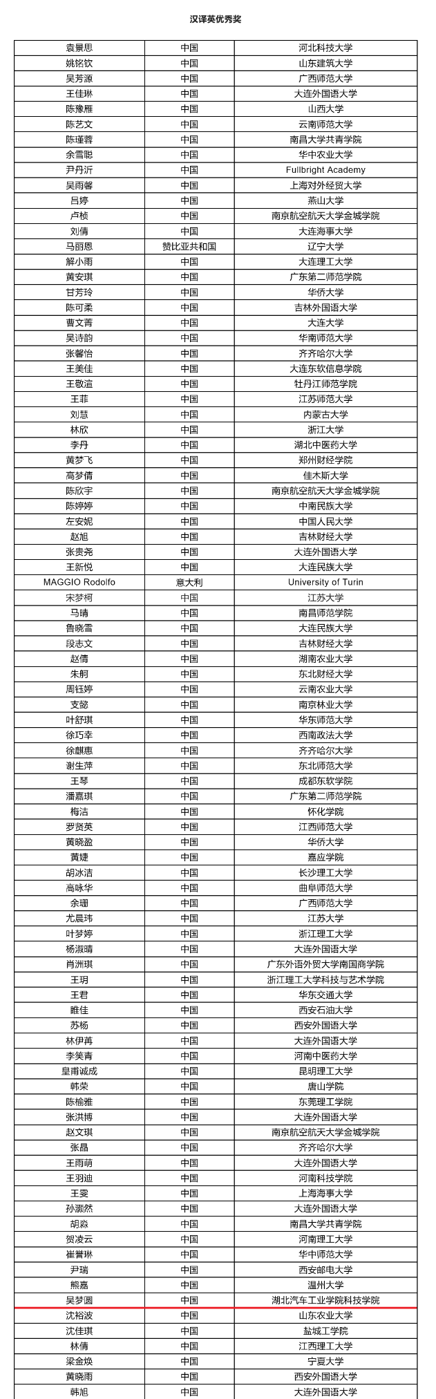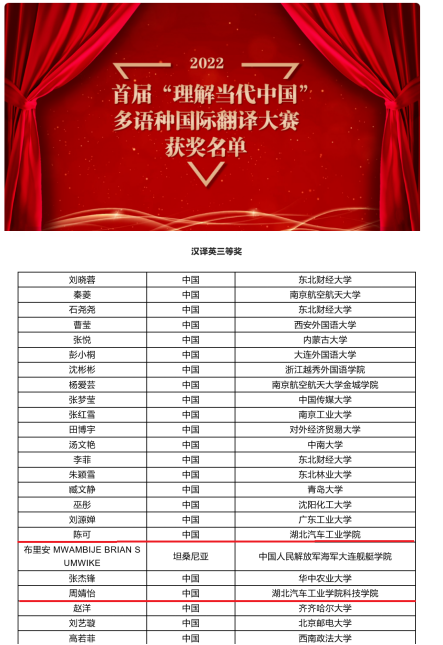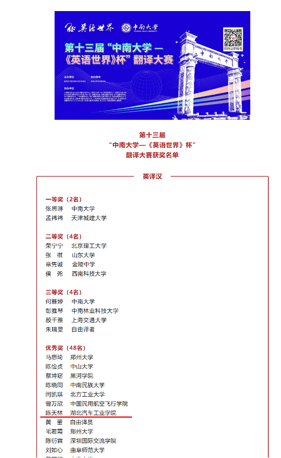 (本网讯)9月30日,第十三届“中南大学——《英语世界》杯”翻译大赛公布获奖名单,我院翻译201班同学陈天林喜获“英译汉”组优秀奖的好成绩。这也延续了我校在2021年第十二届“北京师范大学——《英语世界》杯”翻译大赛取得的好成绩。本届翻译大赛共评出英译汉组一等奖2名、二等奖4名、三等奖4名和优秀奖48名。《英语世界》杯翻译大赛肇始于2010年,由商务印书馆《英语世界》杂志社主办,每年举办一次,已经成为国内最有影响的翻译赛事之一。