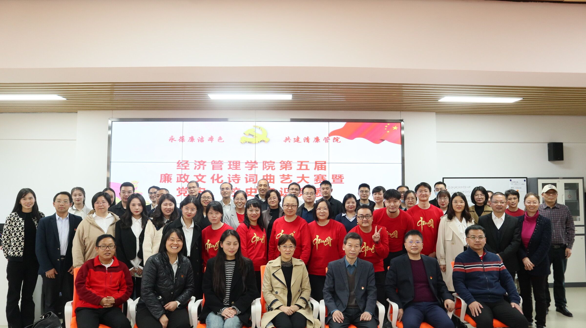 本网讯(文/郑媛元)10月31日下午,经济管理学院在第五教学楼四楼新商科智慧实验室举办了第五届廉政文化诗词曲艺大赛暨党史、校史知识竞赛。校纪委副书记兼综合室主任韩晓、工会常务副主席徐梅、团委文化艺术中心主任董煌煌担任评委。校党委常委、办公室主任、经济管理学院分党委书记王文山、经济管理学院领导班子成员、全体教职工、学生党员参加了此次活动。