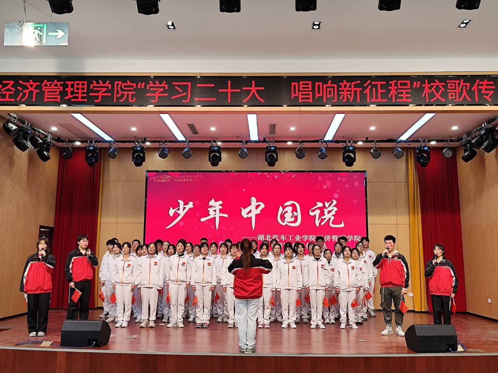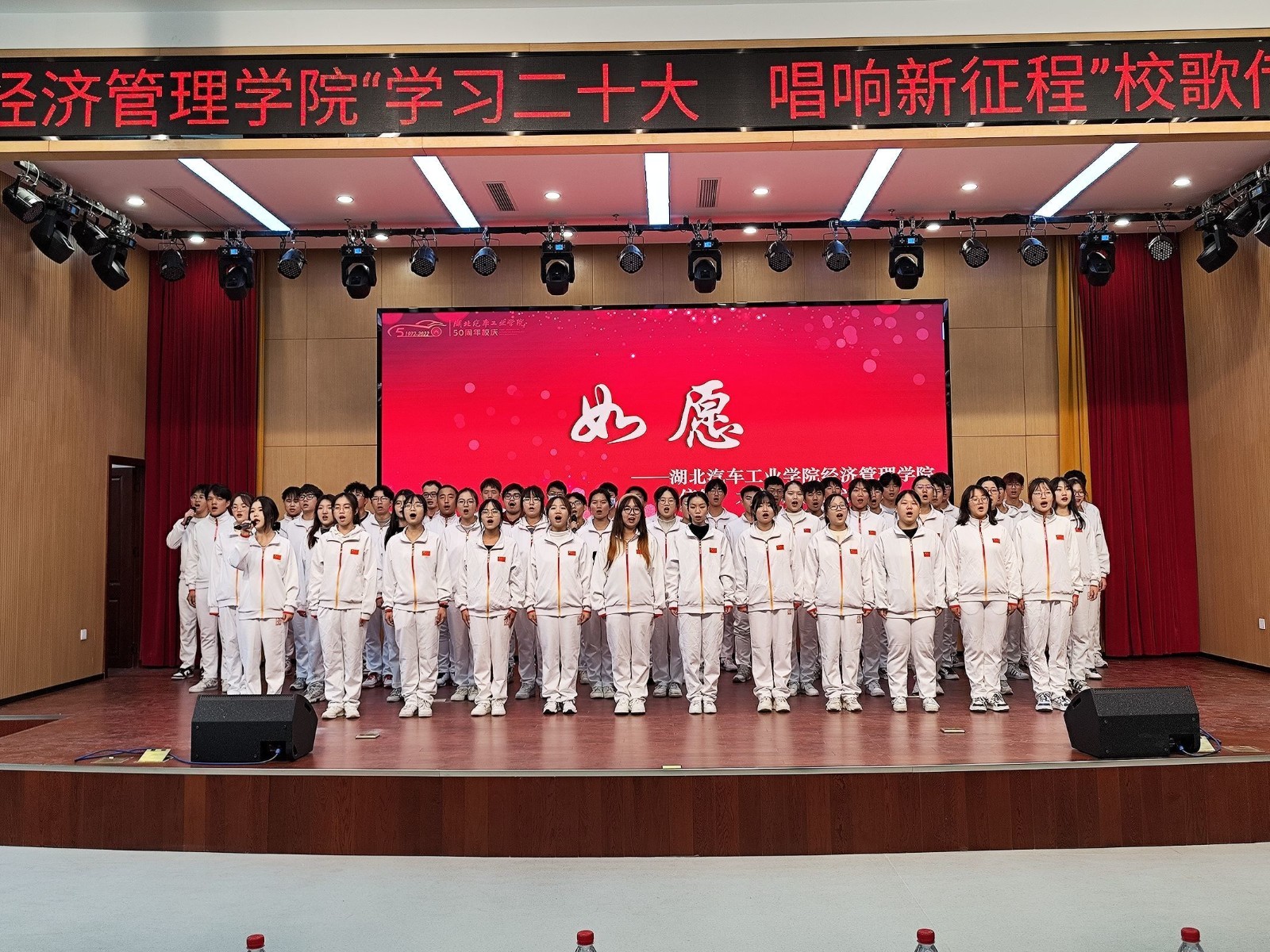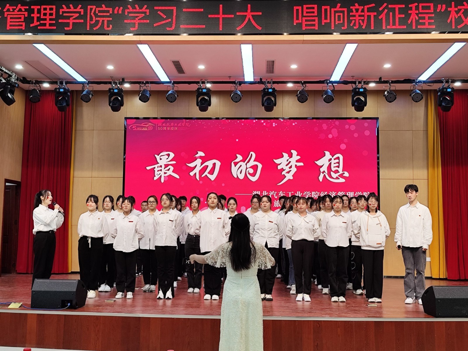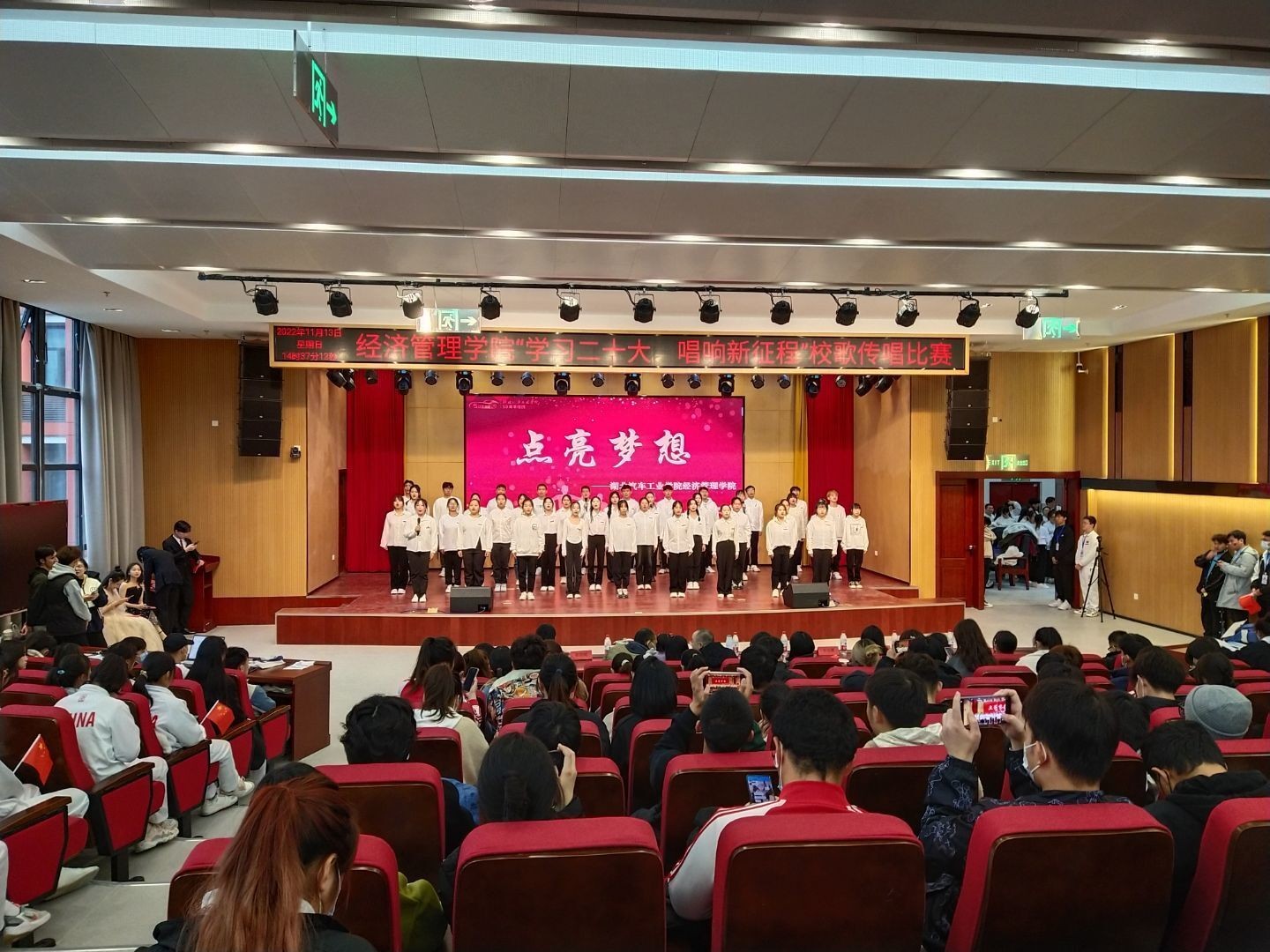 本网讯(文/刘岑希)为深入学习贯彻落实党的二十大精神,喜迎学校50周年华诞,11月13日下午,经济管理学院在产教大楼报告厅举行“学习二十大,唱响新征程”校歌传唱大赛,献礼学校50周年校庆。学院分党委副书记张晓玲、学工办全体辅导员、部分专业老师、2022级新生代表参与活动。