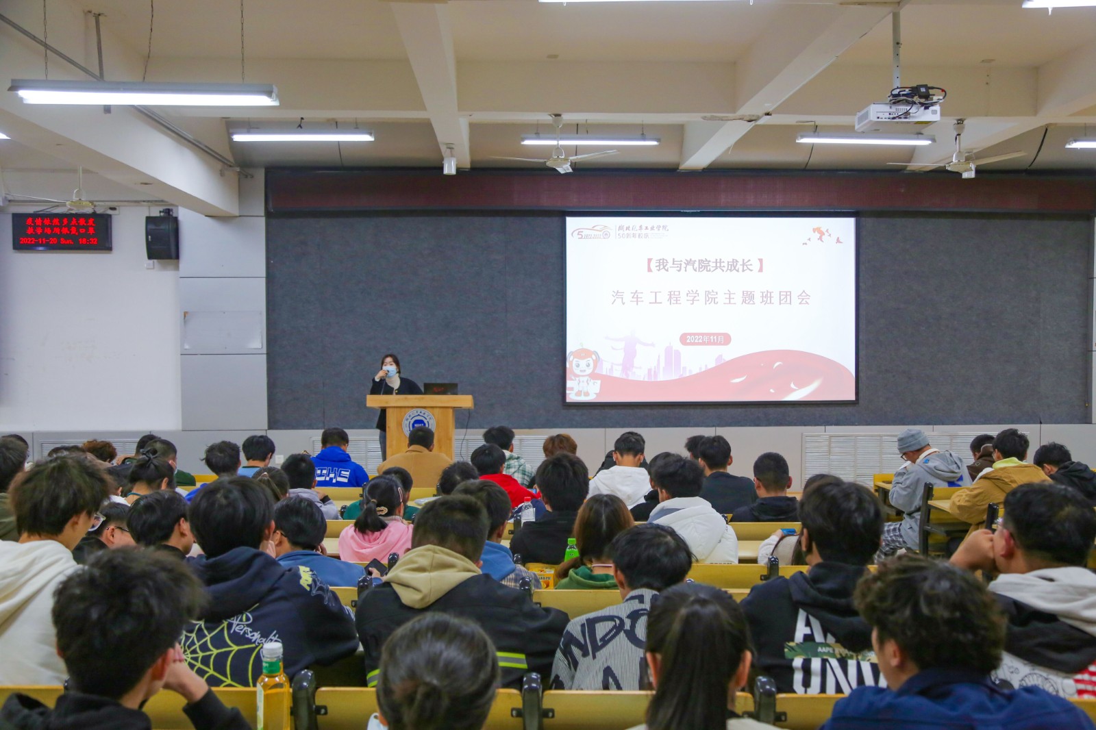 本网讯(文/甘甜 刘越)五十周年校庆即将来临,为进一步加强我校学风建设,扎实做好疫情防控工作,切实做好学生工作,营造浓厚的校庆氛围。汽车工程学院于11月20日晚在6113教室开展“我为校庆做贡献”主题班团会。