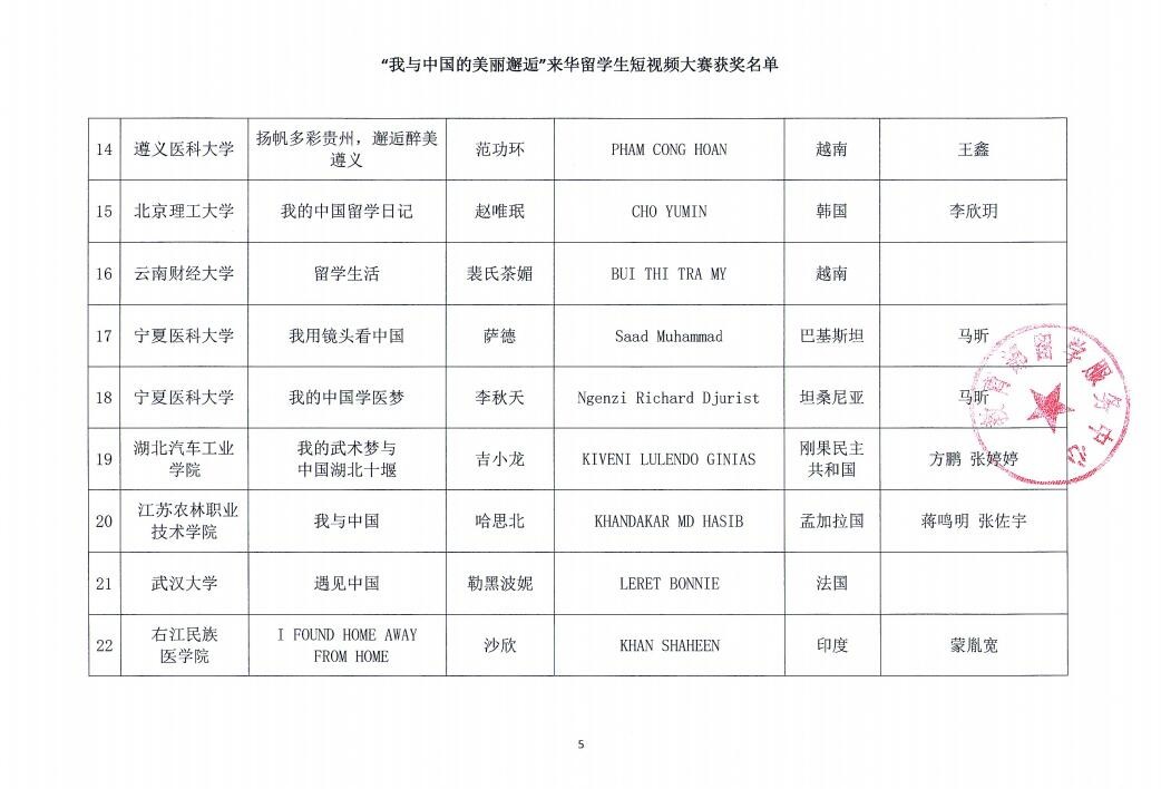 据悉,此次活动由教育部国际合作与交流司主办,教育部留学服务中心承办,面向全体来华留学生、留华毕业生、海外院校汉学院学生学者征集征文或短视频作品,旨在促进不同国家青年一代的人文交流,增进外国留学生知华、友华情怀和对中国发展变化的深刻认知,活动得到了国内外高校、教育机构及留学生个人的广泛关注和积极参与,经过大赛评委会的评审,最终评选出短视频大赛一等奖3名,二等奖5名,三等奖8名,优秀奖29名。(审稿 苏子波)