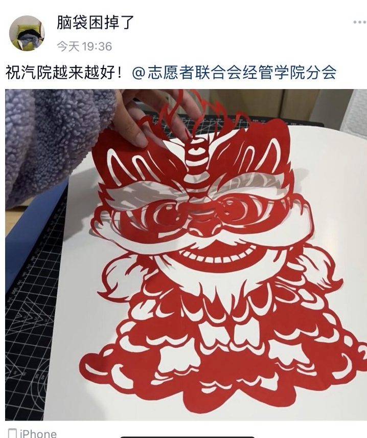 本网讯(文/周晟禹)为喜迎学校50周年校庆,表达汽院学子对母校的美好祝福,丰富同学们的居家生活,12月19日至23日,经济管理学院志联分会红色引擎志愿服务队线上开展了“春晖剪纸,喜迎校庆”主题剪纸活动,以中华民族传统剪纸为媒,大力营造爱校荣校的浓厚氛围,活动吸引了120余名同学打卡参与。
