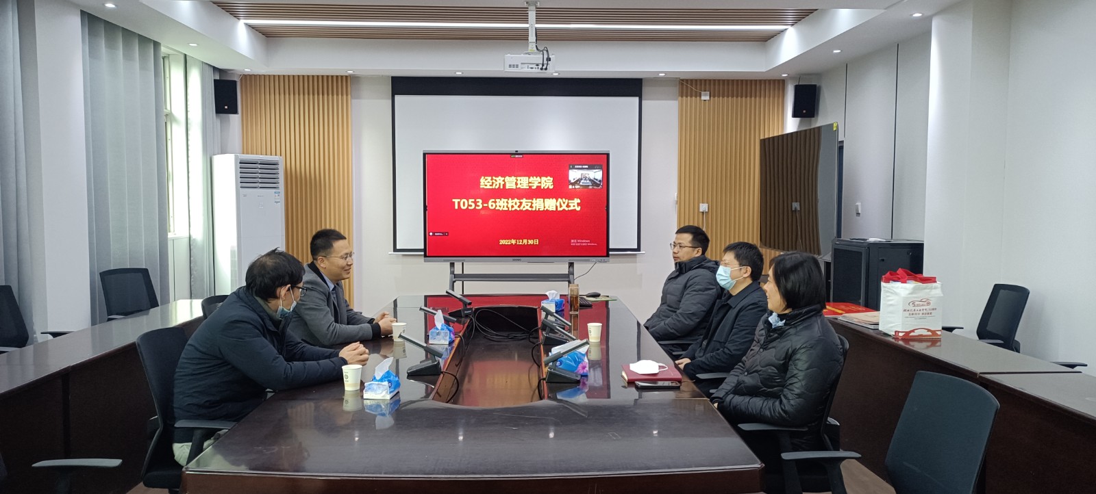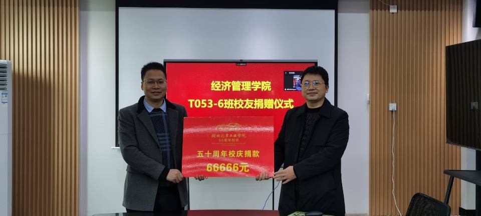 本网讯(文/张朋刚)近日,经济管理学院T053-6班毕业生程世祥代表班级向学校捐赠了66666元,共同庆祝母校50周年校庆。经济管理学院院长钱洁、副院长殷旅江、院长助理程曾平、工会主席张荣欣参加捐赠仪式,班级其他同学代表在线参加了活动。仪式由分党委副书记张晓玲主持。
