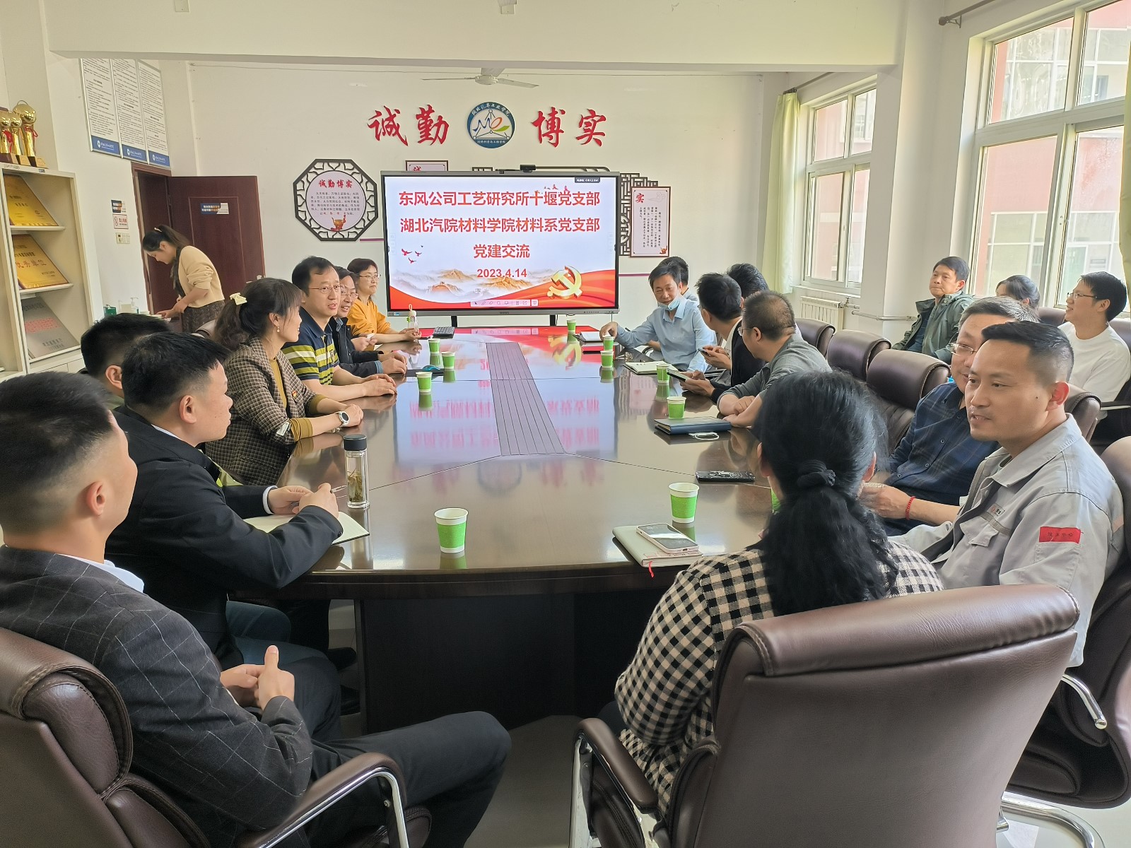 (本网讯)4月14日,东风商用车公司工艺研究所总师赵俊平率领十堰党支部来到我校和材料学院材料系教师党支部开展了“校企合作共育人,支部共建谋发展”为主题的支部共建活动。材料学院分党委书记杨陵郧,材料学院副院长王天国,材料系党支部书记覃群,金属材料系专业负责人罗成及材料系党支部全体教师党员参加了本次活动。