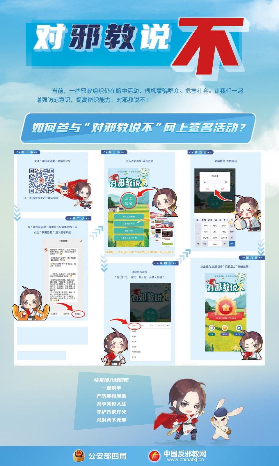 积极组织师生参与“反邪教警示教育进高校”活动,参与由公安部及中国反邪教网主办的线上“对邪教说不”签名活动,进一步强化反邪教知识教育,筑牢反邪防线,引导同学们进一步认清邪教本质和危害。