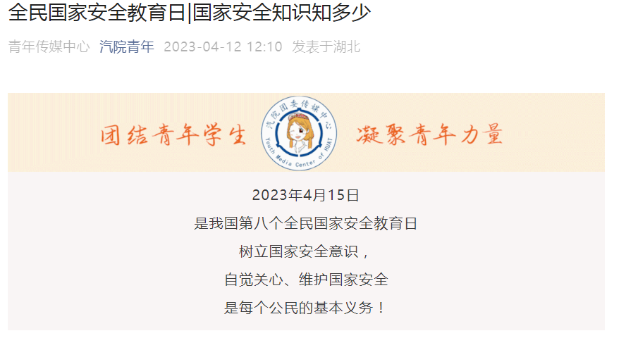 学校积极开辟国家安全教育日“青媒课堂”,利用“汽院青年”微信公众号广泛宣传国家安全相关法律知识,加强对《宪法》《国家安全法》《网络安全法》等法律知识的宣传普及,进一步提升学生的国家安全意识。