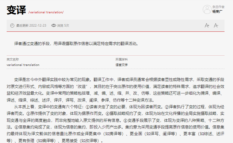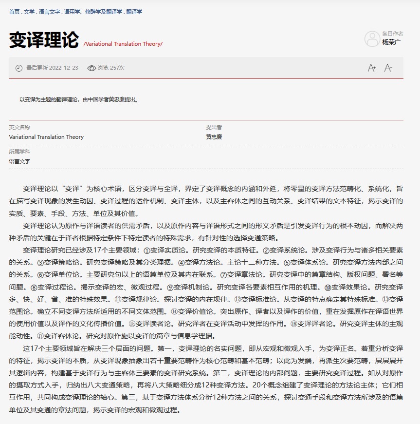 杨荣广在条目中详细说明了变译的基本概念、常用策略与本质特征,深入阐释了变译理论的主要内容及其研究涉及的主要领域,还凝练总结了变译理论旨在解决的问题。