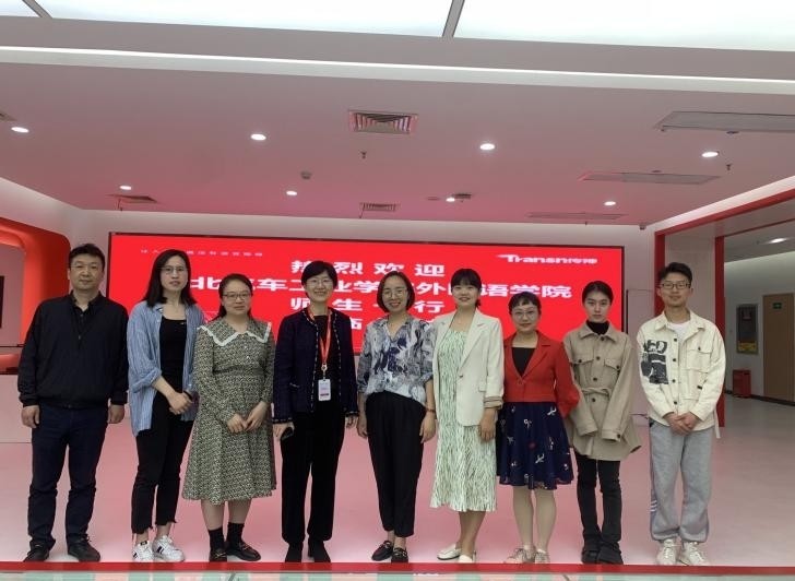 本网讯(文 蔡凤梅/图 叶慧)4月14日下午,外国语学院翻译系专业负责人蔡凤梅老师、翻译系教研室主任叶慧老师、英语系教研室王敬霞老师和王吟老师、翻译系骨干老师李铮老师以及两名学生代表一行7人,前往传神语联网网络科技股份有限公司(武汉)进行参观和学习,旨在加深双方合作的了解,寻求共赢的未来合作方向,以进一步加强“外语+方向”专业内涵建设。