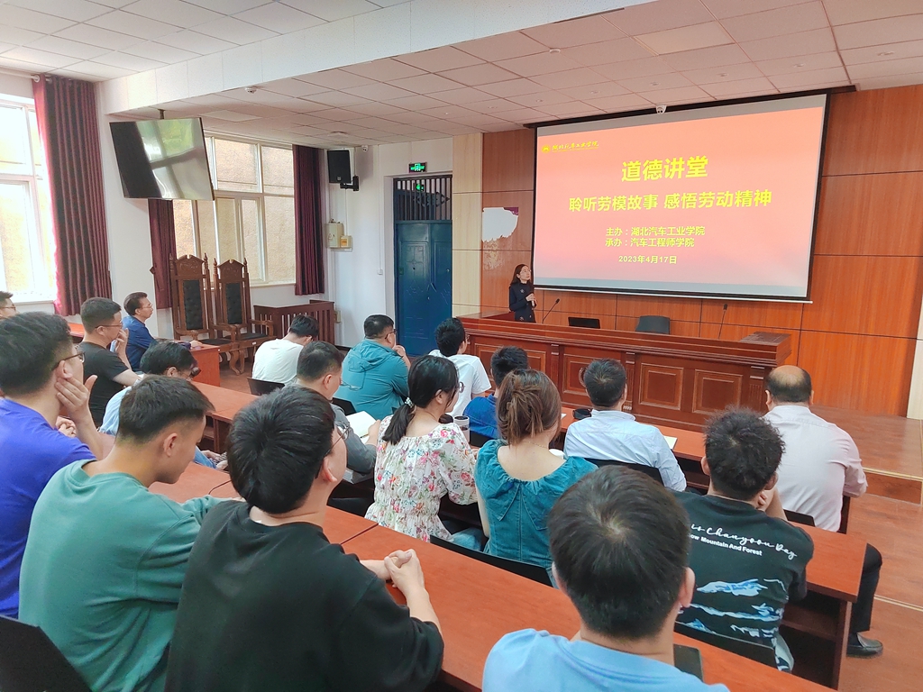 本网讯(文/章秋惠)4月17日下午,为进一步发挥道德模范带动引领作用,在五一国际劳动节到来之际,由校党委宣传部主办,汽车工程师学院承办的2023年第一期道德讲堂于3325教室举行。本次道德讲堂活动以“聆听劳模故事,感悟劳动精神”为主题,主讲人为湖北省五一劳动奖章、湖北省优秀共产党员、湖北省(职工)劳模创新工作室负责人、湖北省十佳师德标兵、享受湖北省政府专项津贴专家,汽车工程师学院院长陈宇峰教授。汽车工程师学院全体教职工、研究生和本科生学生代表参加本次活动。