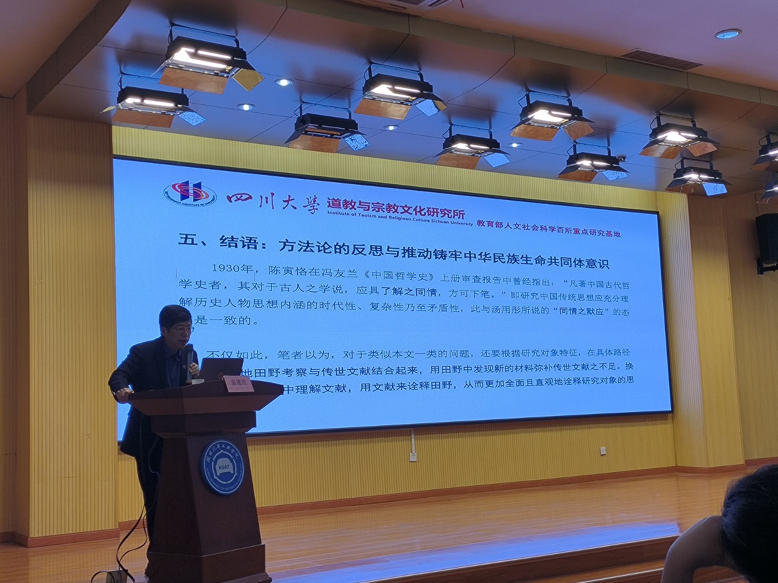 盖建民教授以鲁迅的著名论断“中国的根柢全在道教”为导入,首先结合卿希泰先生对中华民族哲学思想源头的阐释解读了人与自身及外部世界的关系、“自然之道”、“道法自然”等中国哲学基本观点。其次通过田野考察发现文化古迹遗存与西南少数民族民间信仰的密切联系诠释了中国传统哲学思想精华与铸牢中华民族共同体意识之间的深刻关系,并指出其对西南少数民族民间信仰的深刻影响,提出了实现中华优秀传统文化创造性转化、创新性发展”的重要原则。最后,盖建民教授对如何处理田野调查与经典文献的关系时指出要在田野中理解文献,用文献诠释田野,从而更加全面且直观地诠释研究对象的思想内涵,从而研究“真问题”,做“大学问”。