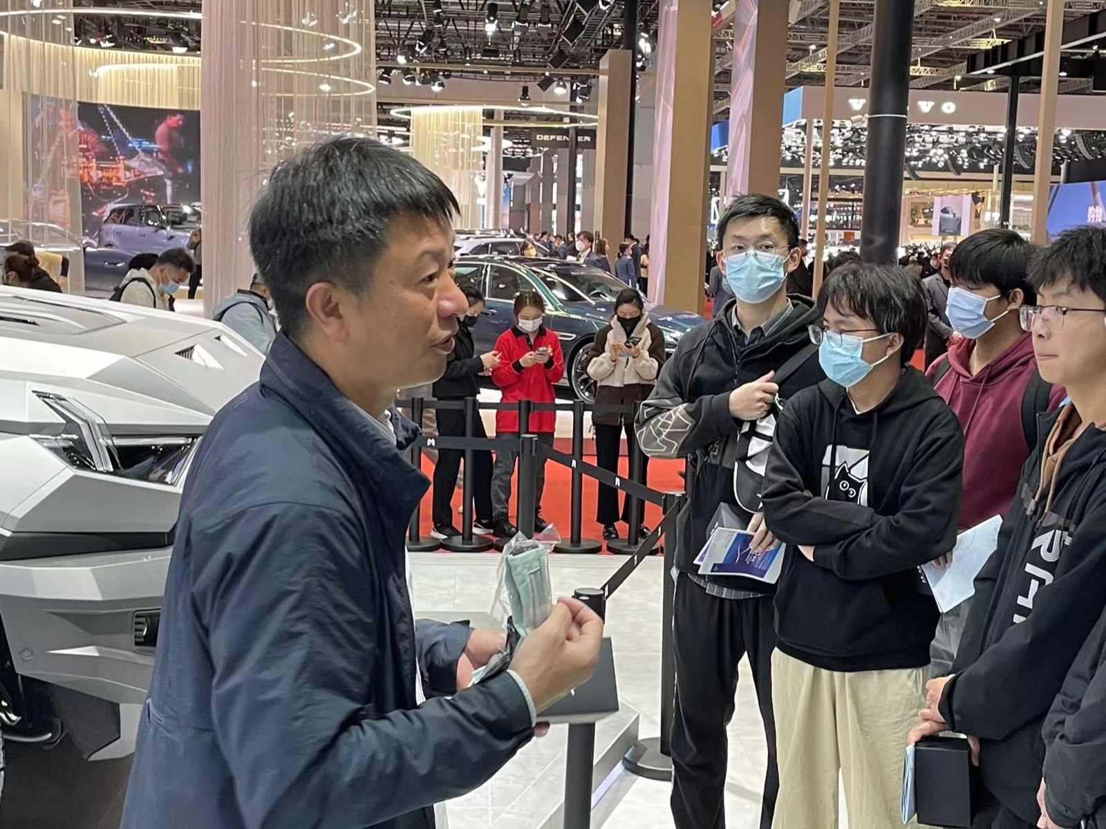 在上海国际汽车工业展览会,鞠清绘教授等带领学生直观深入地了解了汽车造型设计领域前沿动态,并理论联系实际进行了讲解。