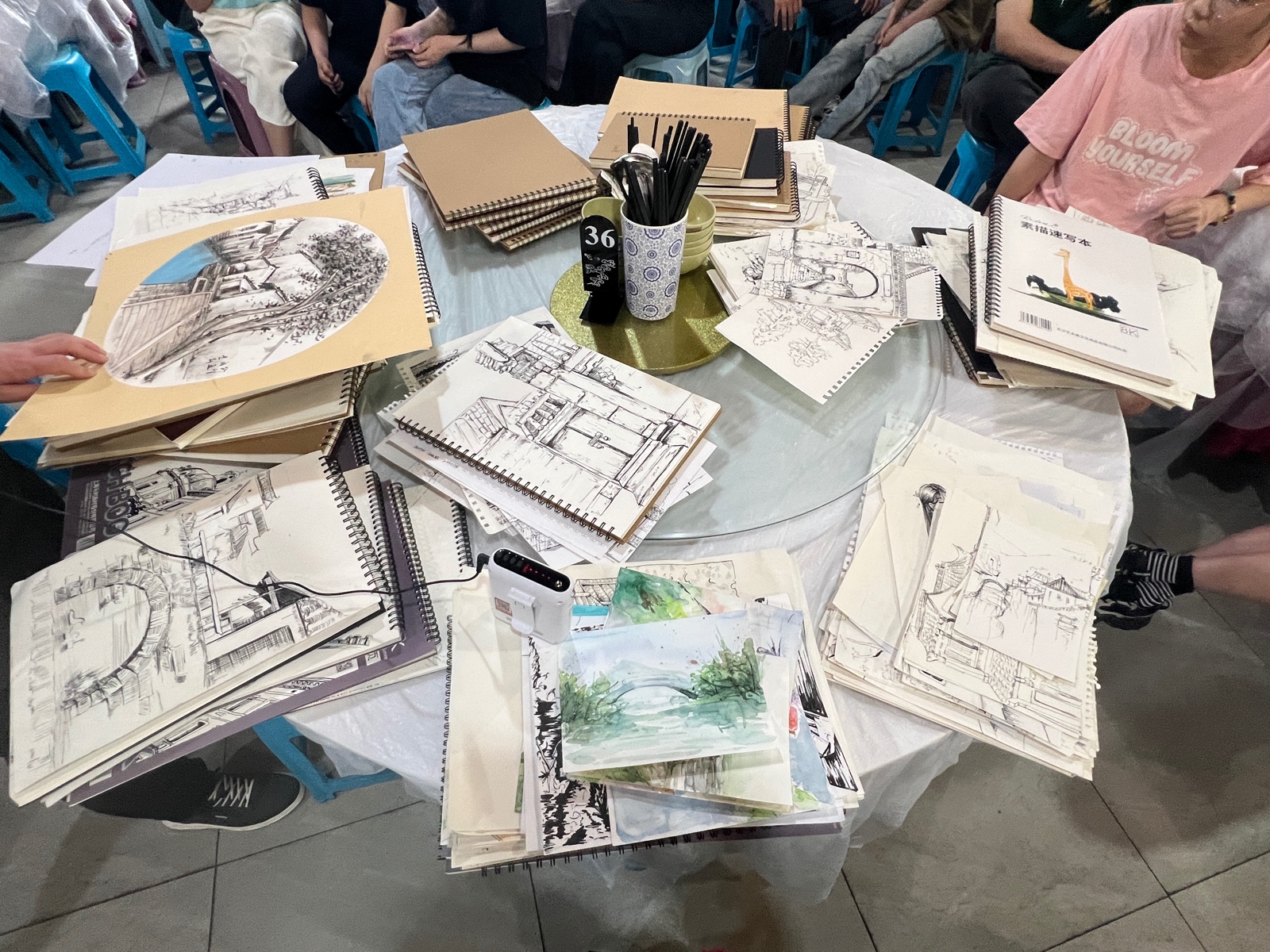 在水乡古镇甪直和南浔古镇,小桥流水、黛瓦白墙,教师与学生们流连忘返,纷纷挑选自己喜欢的景色,用画笔画出心中的热爱。教学与实践经验丰富的鞠清绘教授与谢逢春教授现场耐心为学生们示范,一笔一画看似随意,却又恰到好处。